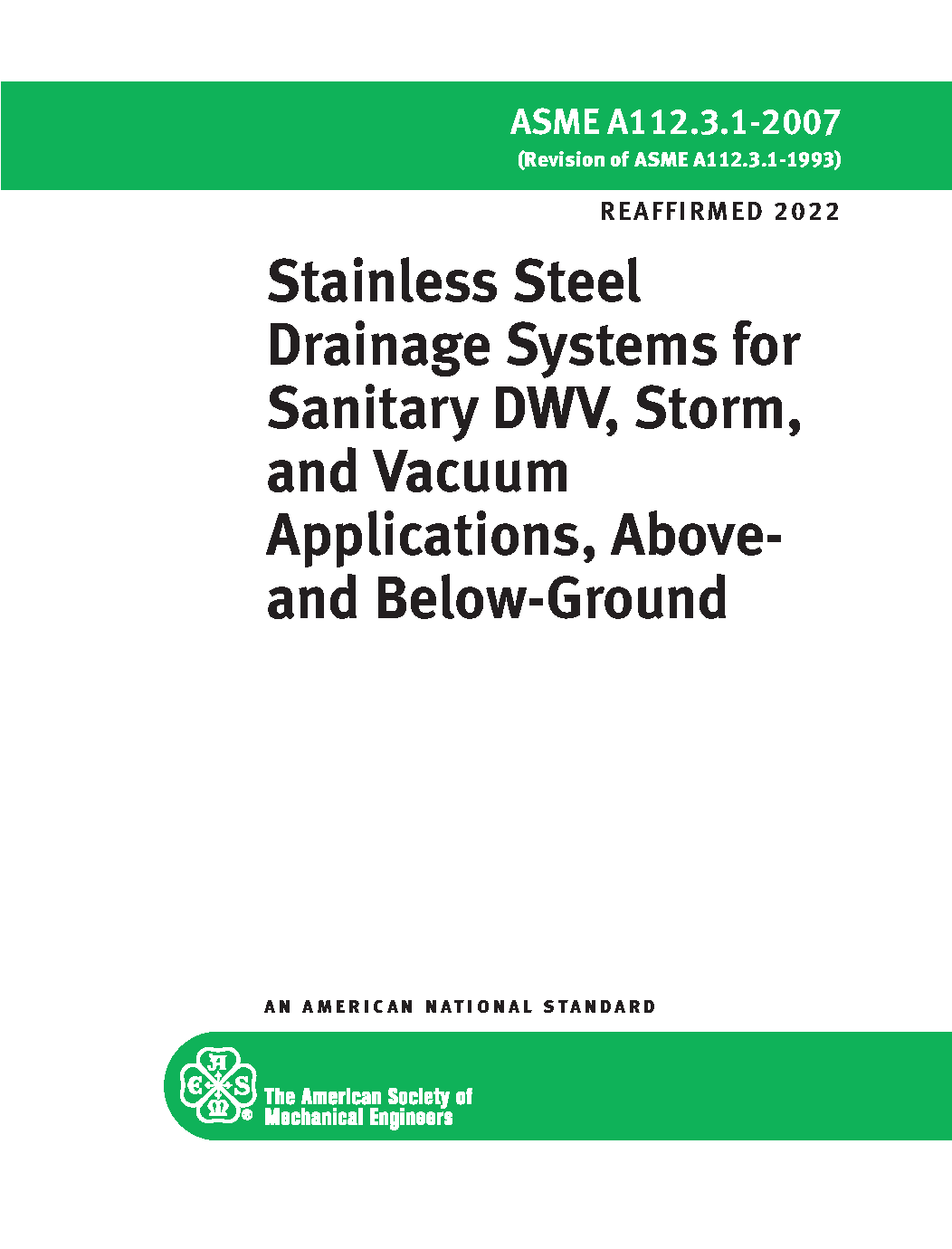 This Standard covers performance and installation requirements for socket-type, seam-welded stainless steel pipe, fittings, joints, and drains for use in plumbing sanitary and storm drain, waste, and vent(DWV), and chemical waste systems.