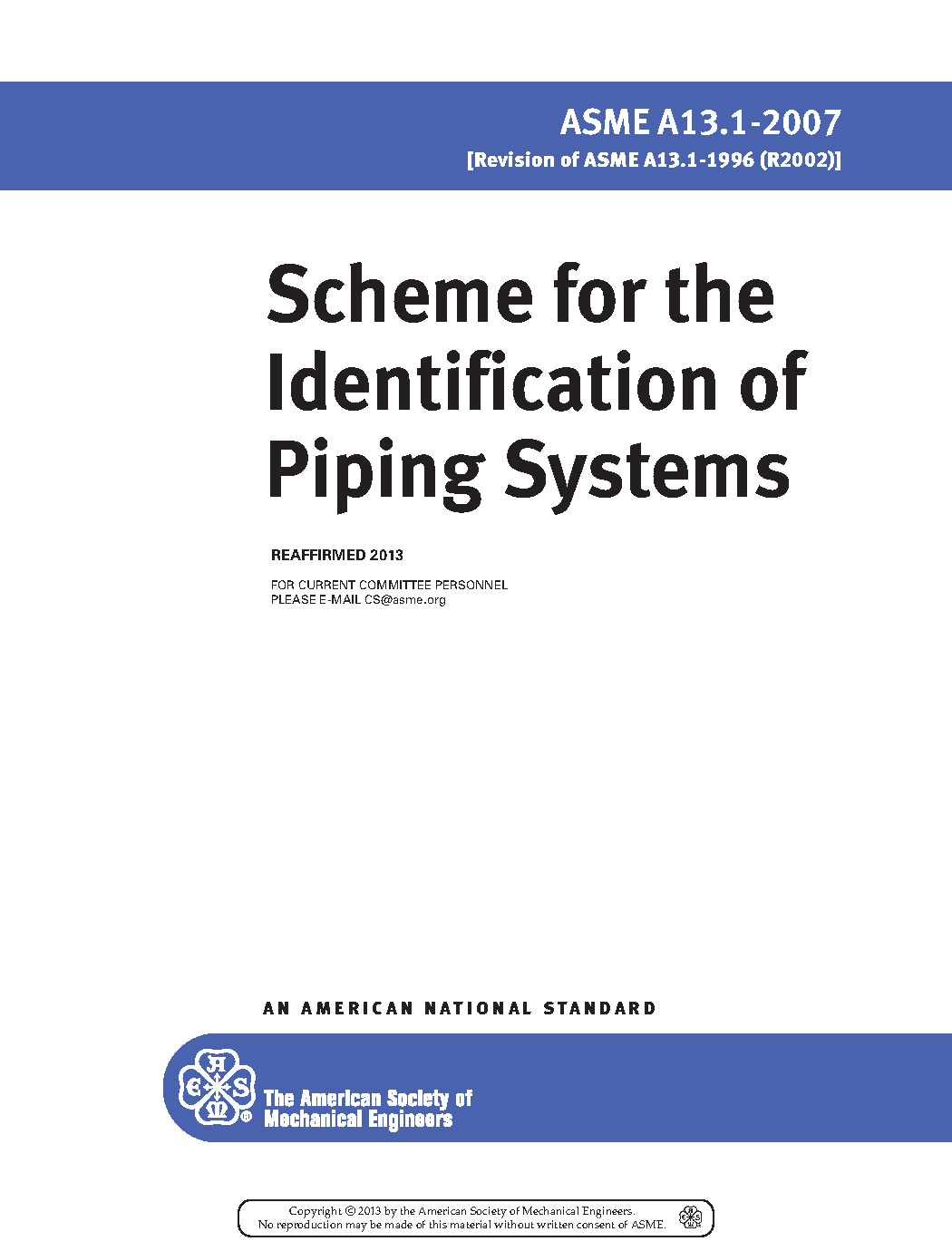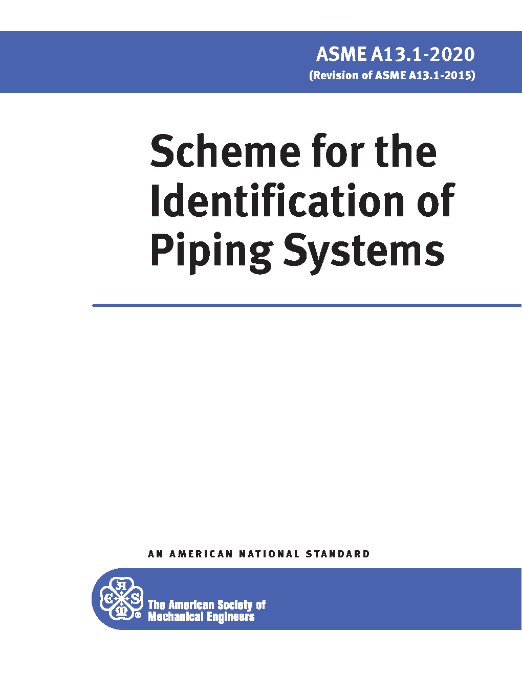 A13.1 is intended to establish a common system to assist in identification of hazardous materials conveyed in piping systems and their hazards when released in the environment. This scheme concerns identification of contents of piping systems in industrial and power plants. It is also recommended for the identification of piping systems used in commercial and institutional installations, and in buildings used for public assembly. It does not apply to pipes buried in the ground nor to electrical conduits.