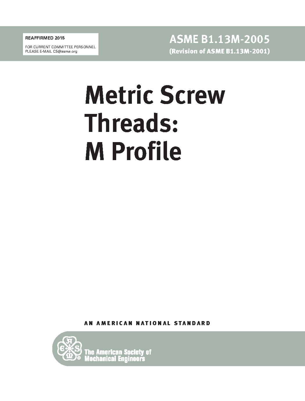 This Standard contains general metric standards for a 60 deg. symmetrical screw thread with a basic ISO 68-1 profile designated M profile. The M profile threads of tolerance class 6H/6g are intended for metric applications where inch class 2A/2B have been used. At the minimum material limits, the 6H/6g results in a looser fit than the 2A/2B. Tabular data is also provided for a tighter tolerance fit external thread of class 4g6g which is approximately equivalent to the inch class 3A but with an allowance applied. Formulation and tolerancing data is included for applications requiring other fits. Note: A 4H5H/4h6h is approximately equivalent to a class 3A/3B fit in the inch system.