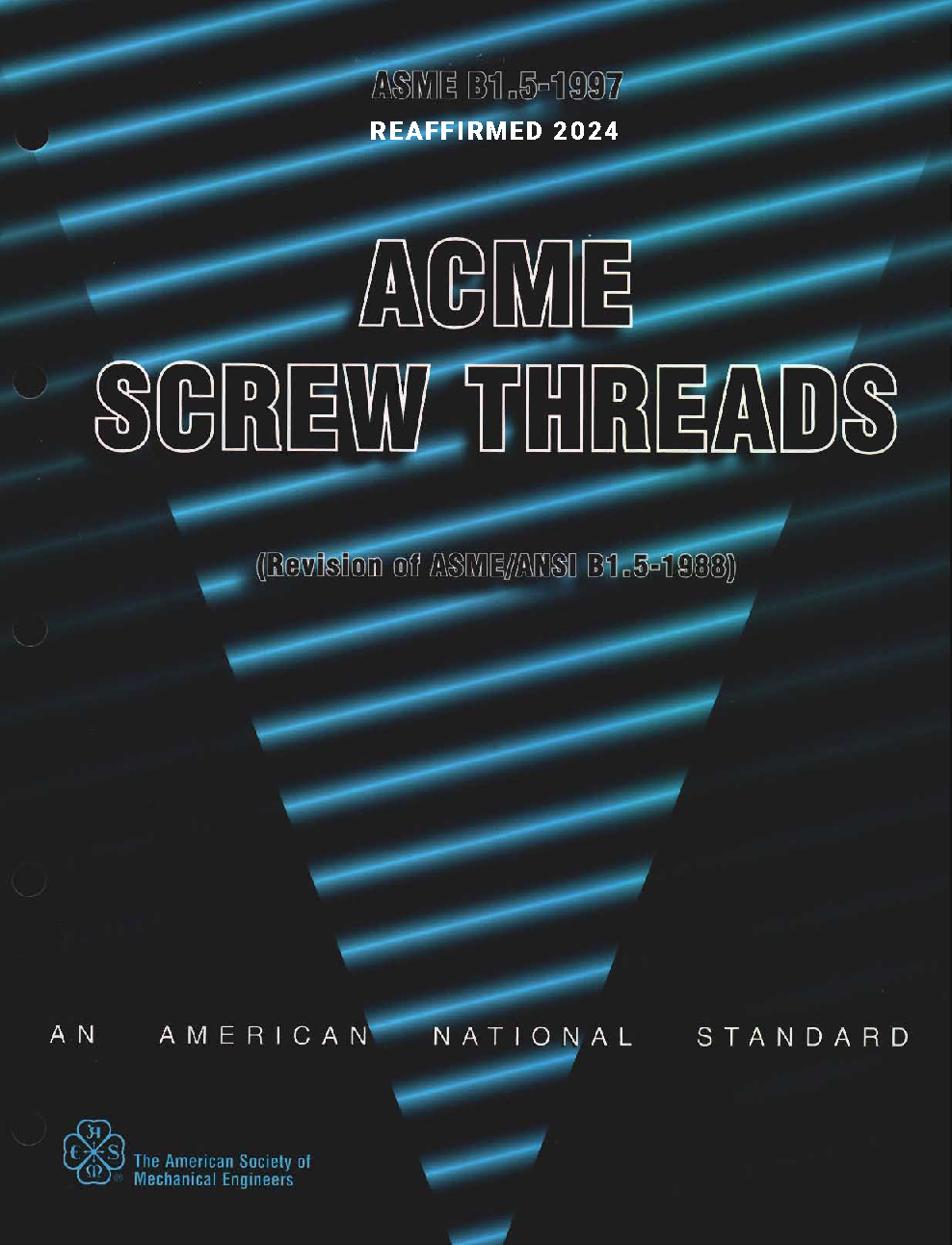 This Standard provides for two general applications of Acme threads: namely, general purpose and centralizing. The limits and tolerances in this Standard relate to single-start Acme threads and may be used, if considered suitable, for multiple-start Acme threads. The latter threads are used to provide relatively fast traversing motion when necessary. The three classes (2G, 3G, and 4G) of general purpose threads have clearances on all diameters for free movement. This thread relies on the thread flanks to maintain concentric operation. The three classes of centralizing threads have a limited clearance at the major diameters of the external and internal threads so that a bearing at the major diameter maintains approximate alignment of the thread axis and prevents wedging on the flanks of the threads. For any combination of the three classes of threads covered in this Standard, some end play or backlash will result. This is unavoidable for interchangeable products. When backlash or end play is objectionable, some mechanical means should be provided to eliminate the condition. In any case, sufficient end play must be left to provide a close running fit. In addition to limiting dimensions for the standard series of diameters and pitches of ACME single-start threads, tables of tolerances, in terms of pitch and diameter, provide for a wide choice of diameters for a given standard pitch. By using the formulas for diameter and pitch increments, the pitch diameter tolerances for special diameters and pitches can be determined for each class. Formulas and data are also provided for allowances on external threads and major and minor diameter allowances and tolerances. The Appendices provide text and dimensions on the following: (a) Alternate Centralizing ACME Threads; (b) Multiple-Start ACME Threads; (c) General Purpose ACME Threads, Class 5G; (d) Centralizing ACME Threads, Classes 5C and 6C; (e) Three-Wire Method of Measurement of Pitch Diameter of 29 deg External ACME Screw Threads; (f) Ball Methods for Internal Pitch Diameter Measurement of 29 deg ACME Screw Threads; (g) Go Gage Compensation, Calculation of Flank Angle, Limit Gaging of Setting Rings, and Gaging Problem Areas; (h) Tolerances for ACME Screw Thread Gages over 5 in.; (i) Determining Limits of Size for Special Diameter/Pitch Combinations.