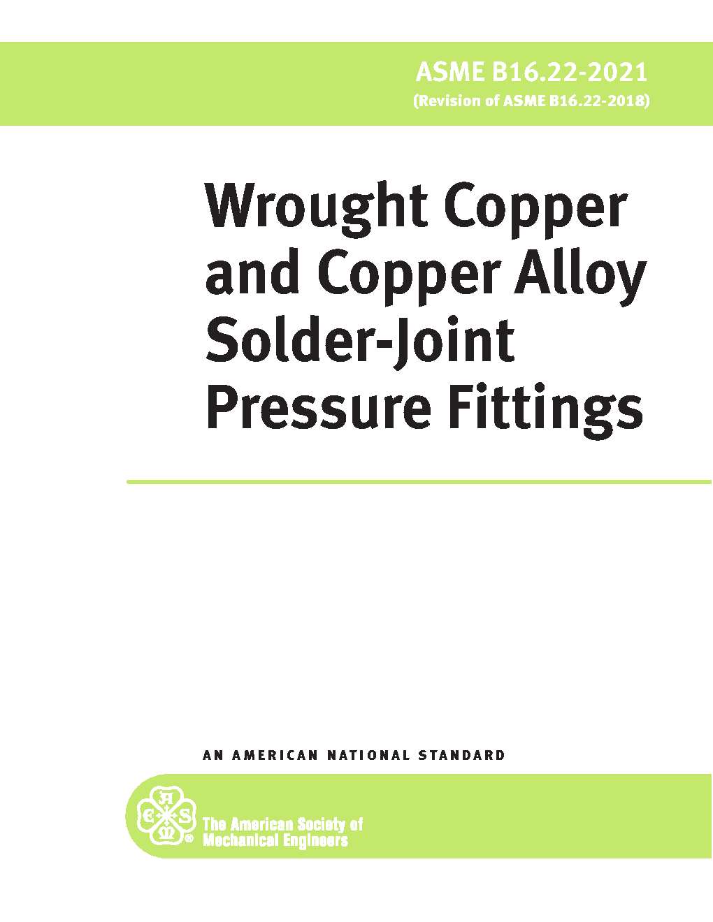 This Standard establishes specifications for wrought copper and wrought copper alloy, solder-joint, seamless fittings, designed for use with seamless copper tube conforming to ASTM B88 (water and general plumbing systems), B280 (air conditioning and refrigeration service), and B819 (medical gas systems), as well as fittings intended to be assembled with soldering materials conforming to ASTM B32, brazing materials conforming to AWS A5.8, or with tapered pipe thread conforming to ASME B1.20.1. This Standard is allied with ASME B16.18, which covers cast copper alloy pressure fittings. It provides requirements for fitting ends suitable for soldering. This Standard covers pressure-temperature ratings, abbreviations for end connections, size and method of designating openings of fittings, marking, material, dimensions and tolerances, and tests.