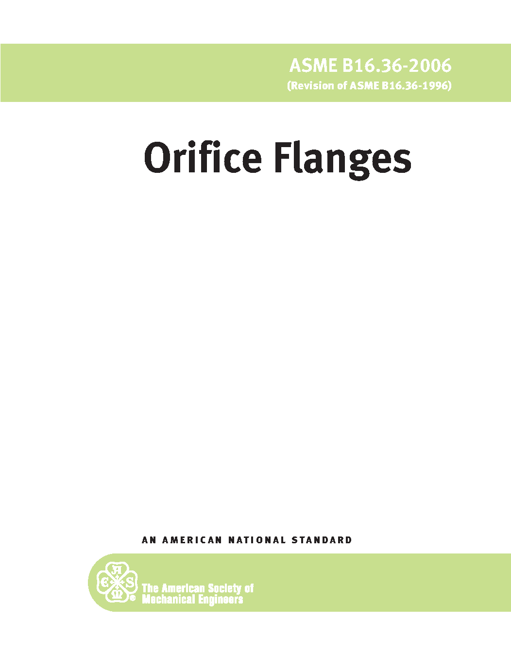 This Standard covers pressure-temperature ratings, materials, dimensions, tolerances, testing, and making of flanges (similar to those covered in ASME B16.5) that have orifice pressure differential connections. Coverage is limited to the following: (a) welding neck flanges Classes 300, 400, 600, 900, 1500, and 2500 (b) slip-on and threaded Class 300.
