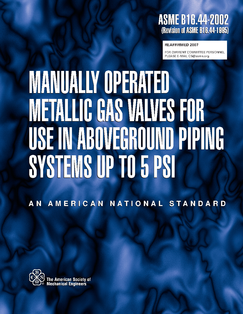 This Standard applies to new valve construction and covers quarter-turn manually operated metallic valves in sizes NPS 1/2-2 which are intended for indoor installation as gas shutoff valves when installed in indoor gas piping between a gas meter outlet & the inlet connection to a gas appliance. The valves covered by this Standard are limited to application temperatures between 32 F and 125 F at pressures not to exceed 5 psig. This Standard does not apply to manually operated gas valves which are an integral part of a gas appliance. Manually operated gas valves intended for application to a particular appliance are covered in the American National Standard for Manually Operated Gas Valves for Appliances, Appliance Connector Valves, and Hose End Valves, ANSI Z21.15.