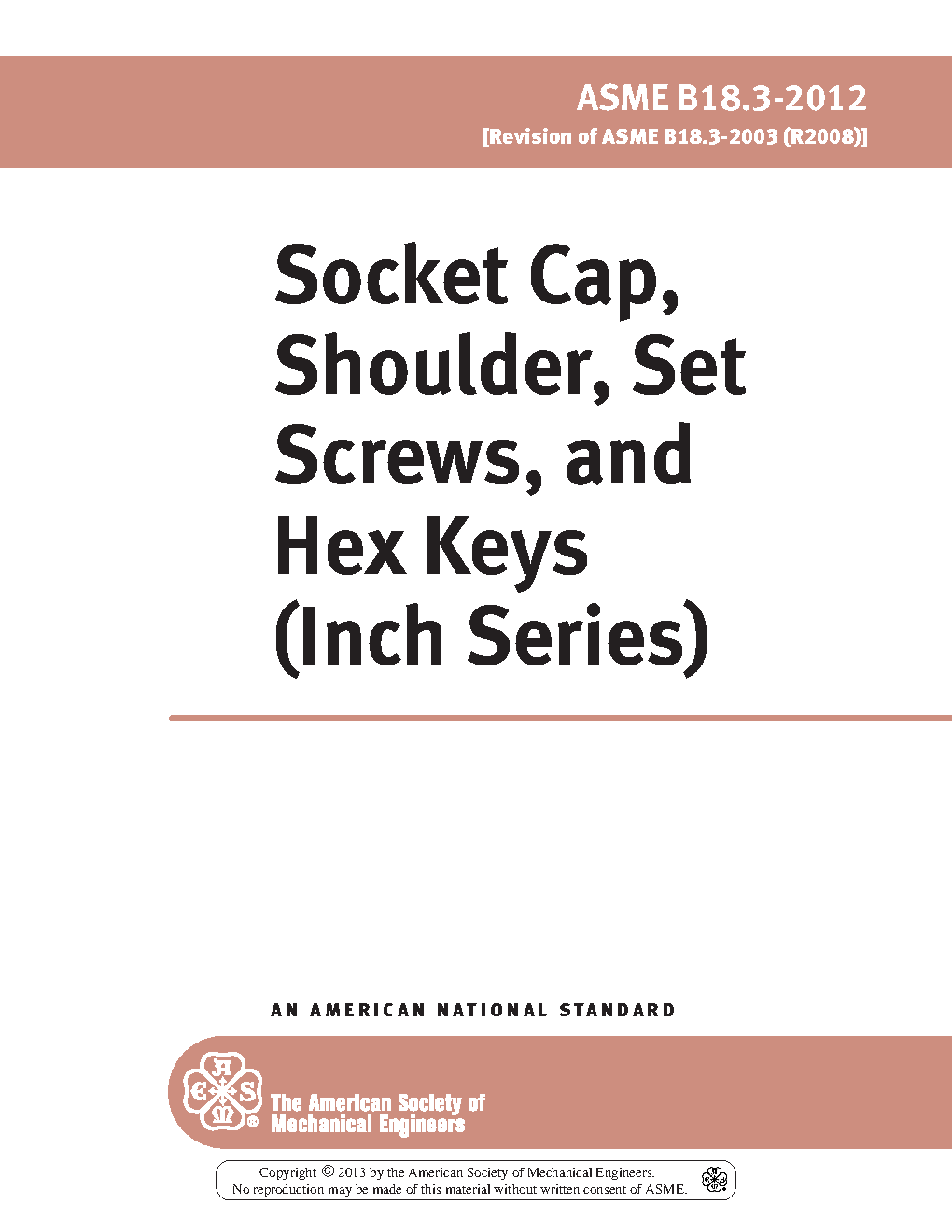 This Standard covers complete general and dimensional data for various types of hexagon socket cap screws, shoulder screws, set screws, and hexagon keys. Also included are appendices that provide specifications for hexagon socket gages and gaging, tables showing applicability of keys and bits to various socket screw types and sizes, drill and counterbore sizes for socket head cap screws, and formulas used for dimensional data. However, where questions arise concerning acceptance of product, the dimensions in the tables shall govern over recalculation by formula. The inclusion of dimensional data in this Standard is not intended to imply that all of the products described are stock production sizes. Consumers should consult with manufacturers concerning lists of stock production sizes.