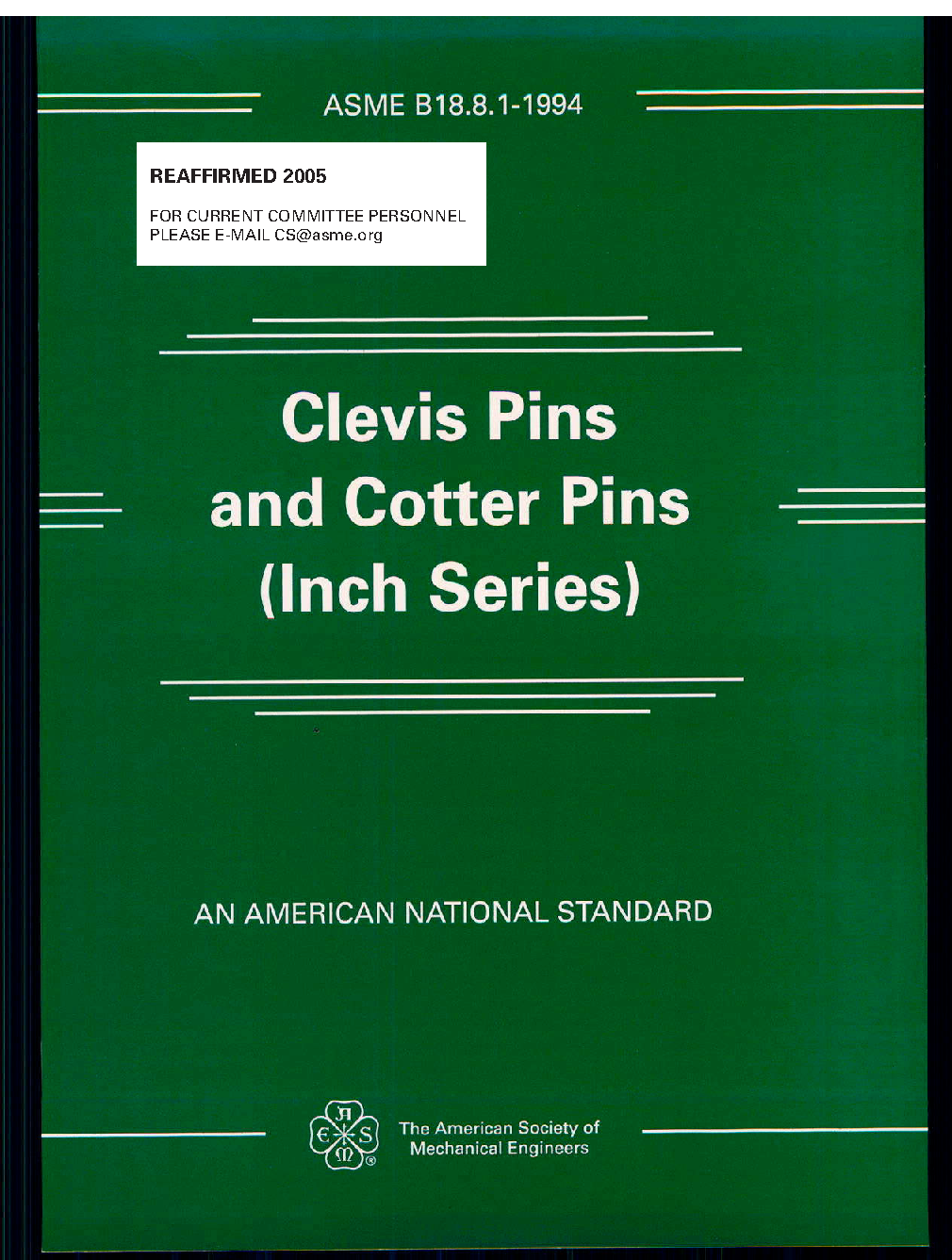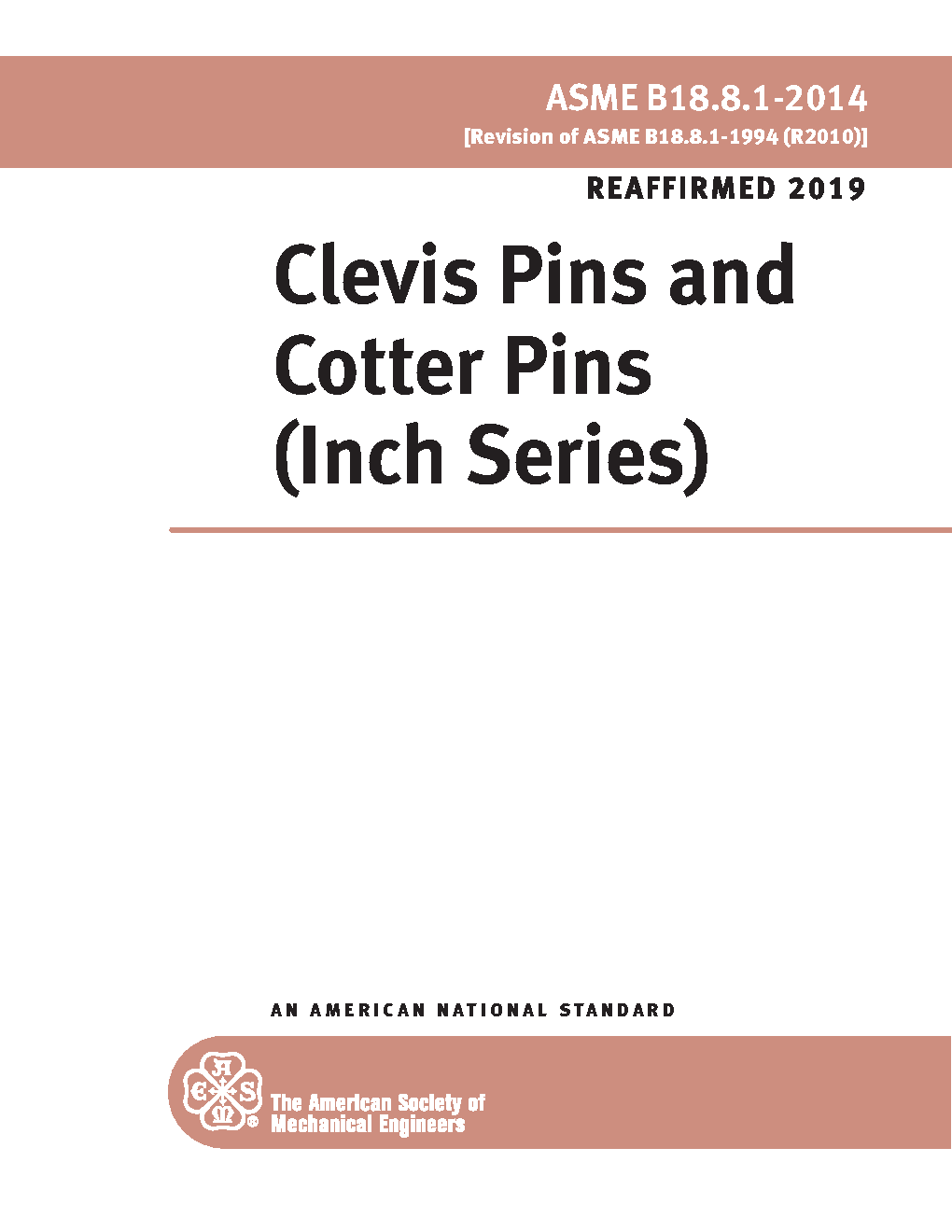 This Standard covers the complete dimensional and general data for clevis pins sizes 3/16 through 2 inch and cotter (split) pins sizes 1/32 through 3/4 inch of various materials. The inclusion of dimensional data in this Standard is not intended to imply that all products described are stock production items. Consumers should consult with suppliers concerning the availability of products.
