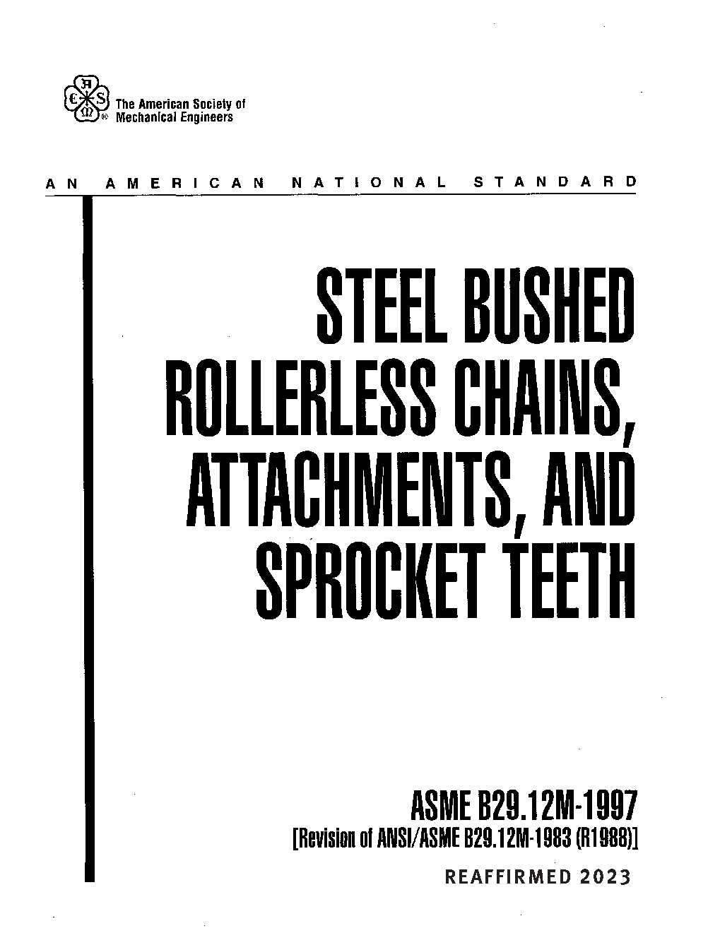 This Standard provides the following information for Steel Bushed Rollerless Chains, Attachments, and Sprocket Teeth: A series of block links having steel bushings to contact the sprocket teeth, alternating with links composed of sidebars and pins which articulate in the steel bushings of the block link. The main topics are (a) General Chain Proportions and Designations; (b) Chain and Attachment Dimensions; and (c) Sprocket Tooth Form. There are also Tables for (a) General Chain Dimensions, Minimum Ultimate Tensile Strength, Strand Length and Measuring Load; (b) Maximum and Minimum Controlling Dimensions for Interchangeable Chain Links; (c) Chain Clearance Dimensions; (d) A-1, A-2, A-22, K-1, K-2, K-3, K-35, K-44, & K-443 Attachments; (e) Sprockets - Maximum Eccentricity and Face Runout Tolerances; and (f) Sprocket Tooth Form Factors.