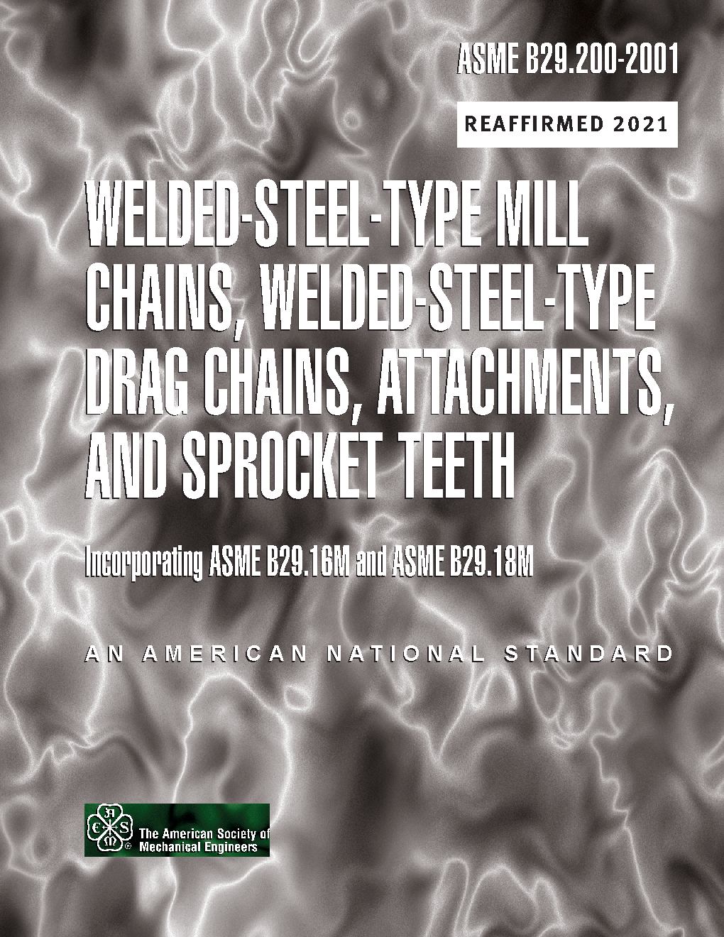 There is a newer edition of this document available. This Standard is a consolidation of two ASME Standards, ASME B29.16M-1995 (Welded Steel-Type Mill Chains, Attachments, and Sprocket Teeth) and ASME B29.18M-1993 (Welded Steel-Type Drag Chains, Attachments, and Sprocket Teeth). These two Standards were combined into one because of the similarity of construction and the usual applications for the two types of chains. The welded-steel-type mill chains (B29.16M) were developed to provide a series of steel chains similar to cast chains of the detachable, mill, and combination types. A welded steel-type mill chain is a series of identical welded offset links having barrels to contact the sprocket teeth, and pins which articulate in the barrels of the links. Pins are fixed in the sidebar pitch holes by either press fits and/or mechanical locks , such as flats, to prevent rotation of the pins in the sidebar pitch holes. The main topics of B29.16M are (a) Assembled chain; (b) Disassembled chain; (c) Dimensions of chain; and (d) Sprocket tooth form. There are also Tables for (a) General chain dimensions, Minimum ultimate tensile strength rating, Strand length, and Measuring load for checking chain lengths; (b) Maximum and minimum controlling dimensions for interchangeable chain links; (c) Chain clearance dimensions; (d) A1, A2, A22, F2, F4, K1, K2 and W1 attachments; (e) Sprockets Maximum eccentricity and Face runout tolerances; and (f) Sprocket tooth form factors. Although the welded-steel type mill chains were introduced many years ago for the forest products industries, their extended usage in a variety of materials handling and drive applications in recent years stimulated standardization of the basic types. The welded-steel-type drag chains (B29.18M) were developed to provide a series of steel chains similar to cast drag chains in the offset and combination types. Welded steel drag chains were originally introduced for the forest products industries and their expanded usage in recent years called for standardization of basic sizes. A welded-steel-type drag chain is a series of identical welded offset links having barrels to contact the sprocket teeth, and pins which articulate in the barrels of the links. Pins are fixed in the sidebar pitch holes by either press fits and/or mechanical locks, such as flats, to prevent rotation of the pins in the sidebar pitch holes. The main topics are (a) general chain proportions and designations; (b) Attachments; (c) Sprocket tooth form; and (d) Sprocket design data. There are also Tables for (a) Barrel cross section; (b) General chain dimensions, Minimum ultimate tensile stregth, measuring length, and Load for checking chain lengths; (c) Maximum and minimum controlling dimensions for interchangeable chain links; (d) Chain clearance dimensions; (e) C1, C3, C4, RR and wing-type attachments; (f) Sprocket tooth form factors; and (g) Sprockets: Maximum eccentricity and Face runout tolerances.