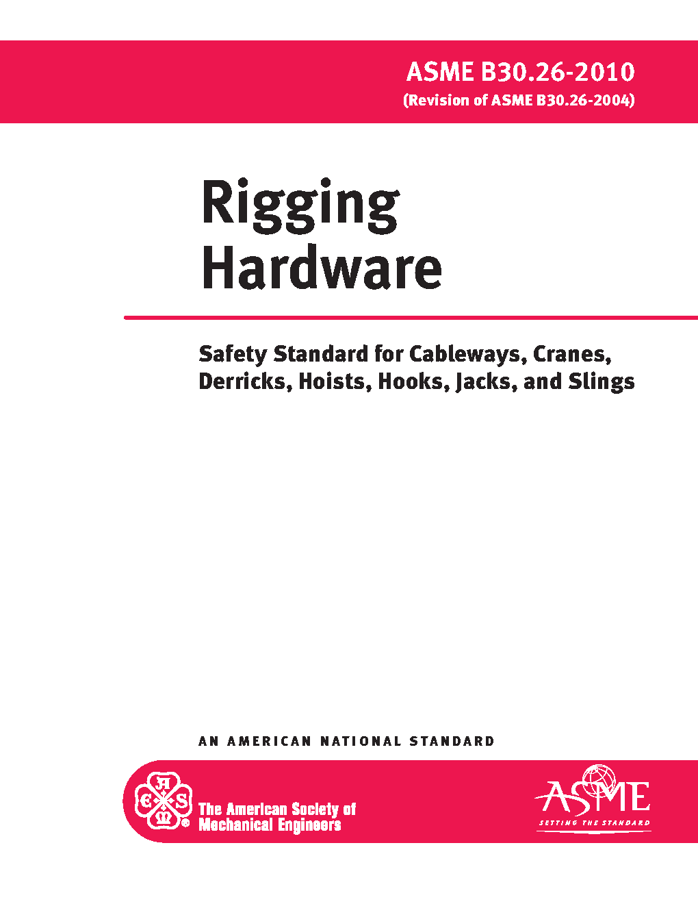 B30.26 applies to the construction, installation, operation, inspection, and maintenance of detachable rigging hardware used for load handling activities in conjunction with equipment described in other volumes of the B30 Standard. This hardware includes shackles, links, rings, swivels, turnbuckles, eyebolts, hoist rings, wire rope clips, wedge sockets, rigging blocks and load indication devices.