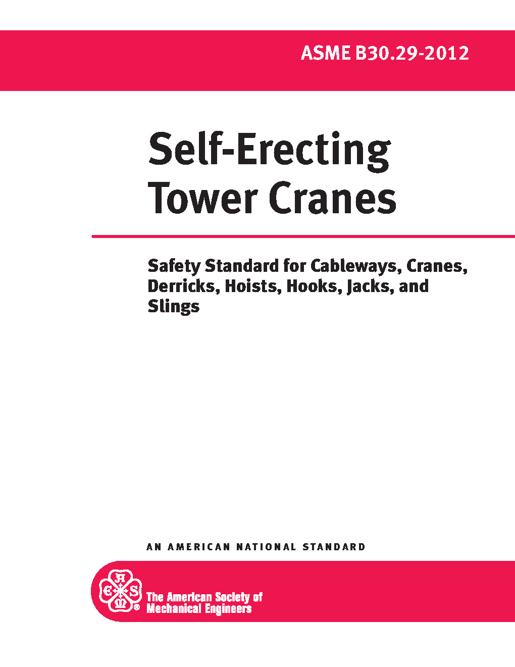 Applies to the construction, operation, inspection, testing and maintenance of powered, self-erect tower cranes, which adjust operating radius by means of a trolley traversing a jib. These may be horizontal, elevated, articulating, or telescoping, used for vertical lifting and lowering of freely suspended, unguided loads which consist of equipment and materials. Self-erect tower cranes have vertical or nearly vertical masts that are bottom slewing and mounted on fixed, traveling, or mobile bases. The cranes are capable of moving or being moved from jobsite to jobsite fully assembled or nearly fully assembled. This volume does not apply to cranes used for non-vertical lifting service or lifting a guided load and truck-mounted material delivery cranes with a tubular boom and trolley traversing the boom. Tower cranes (refer to ASME B30.3) and mobile crane tower attachments (refer to ASME B30.5) are not within the scope of this volume.