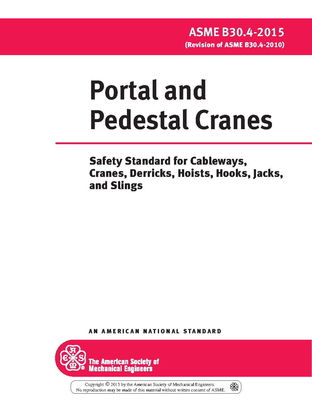 B30.4 applies to the construction, installation, operation, inspection, and maintenance of electric motor or internal-combustion engine powred portal and pedestal cranes, that adjust operating radius by means of a boom luffing mechanism or by means of a trolley traversing a horizontal boom, that may be mounted on a fixed or traveling base, and to any variation thereof that retain the same fundamental characteristics. This standard applies only to portal and pedestal cranes utilizing a drum and wire rope for hoisting and which are used for hoisting work. The requirements for tower cranes (refer to ASME B30.3), telescopic boom cranes (refer to ASME B30.5), and knuckleboom cranes (refer to ASME B30.22) are not included in this standard.