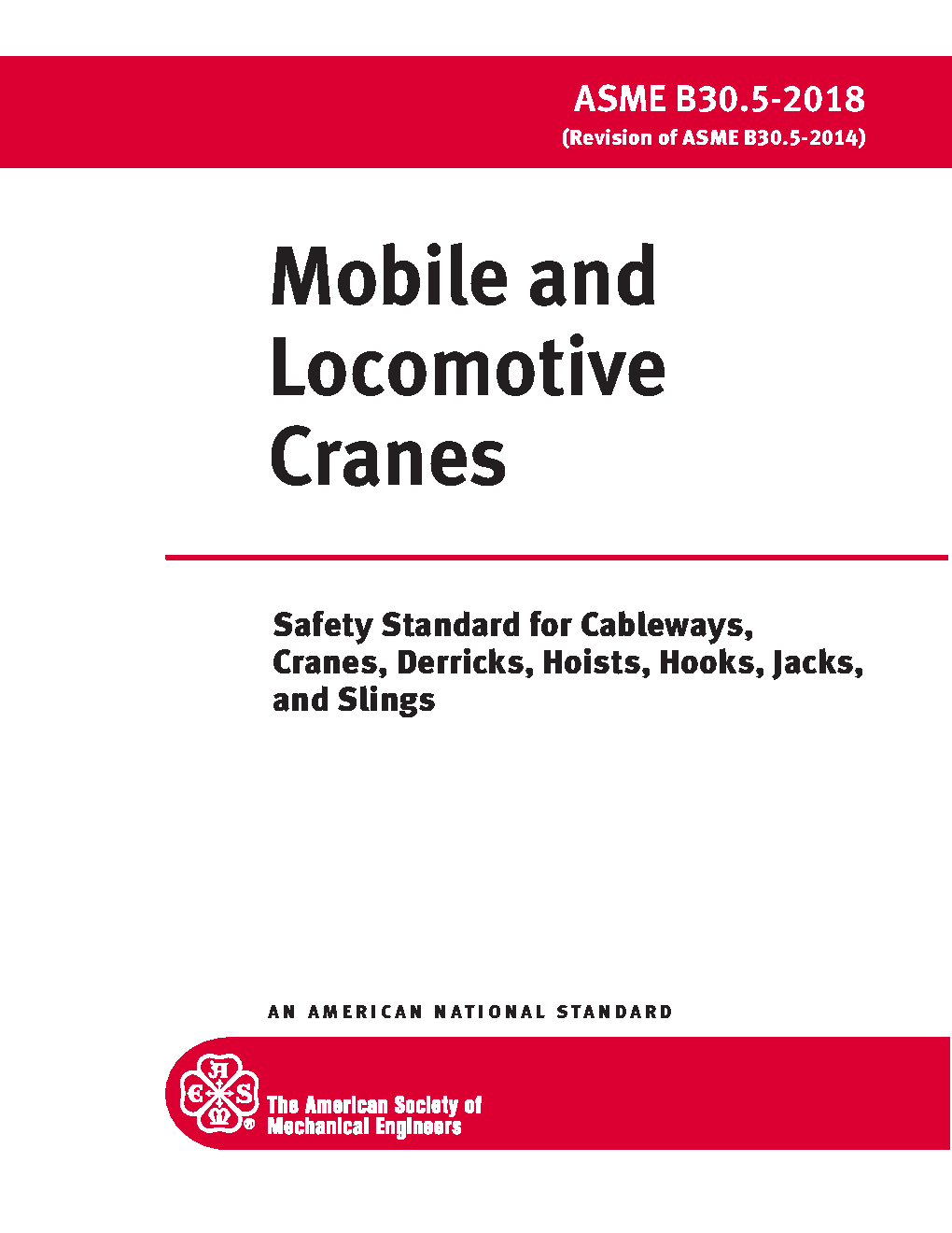 ASME B30.5 is one of ASME's most requested safety standard's widely respected and applied throughout the building and construction industry. It addresses crawler cranes, locomotive cranes, wheel-mounted cranes, and any variations thereof that retain the same fundamental characteristics and are powered by internal combustion engines or electric motors. The scope of this Safety Standard includes only cranes of the above types that are powered by internal combustion engines or electric motors. Side boom tractors and cranes designed for railway and automobile wreck clearance, digger derricks, cranes manufactured specifically for, or when used for, energized electrical line service, knuckle boom, trolley boom cranes, and cranes having a maximum rated capacity of one ton or less are excluded.