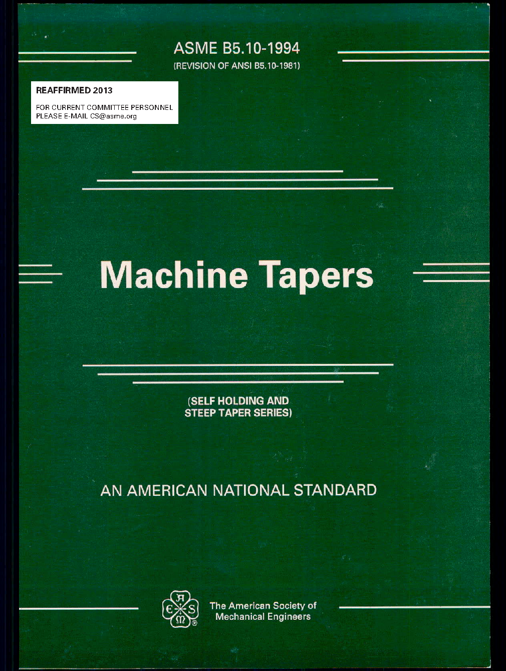 This standard establishes (1) Practice for the slope of self-holding and steep machine tapers, (2) The detailed dimensions for this type of taper tool shank, (3) The corresponding dimensions for the taper socket in the spindle of the machine, including the dimensions of keyways. This will serve as a guide for future designing of machines and related equipment utilizing tapers.