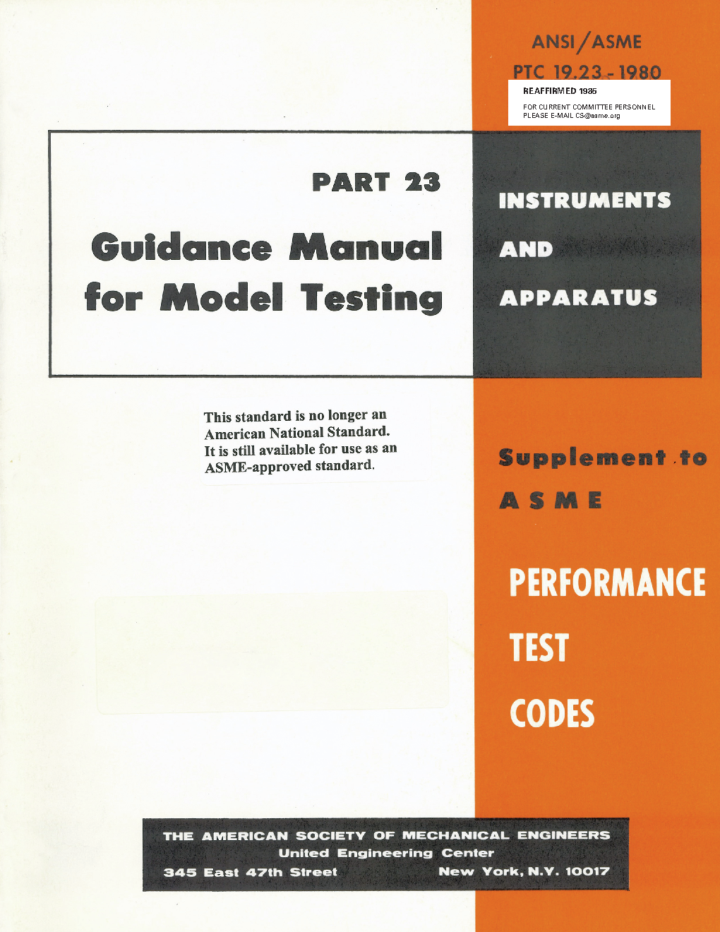 This Standard provides guidance for the design and application of models by those concerned with the extension or supplementation of prototype tests of equipment using ASME Performance Test Codes. Where there are test codes in existence covering specific equipment, the guiding principles, instruments and methods of measurement from such codes shall be used with only such modifications as become necessary by virtue of the fact that a model is being tested instead of a prototype. A model is a device, machine, structure or system which can be used to predict the behavior of an actual and similar device, machine, structure or system which is called the prototype. A physical model may be smaller than, the same size as, or larger than the prototype. PTC 19.23 consists of (a) General discussion of model testing; (b) Example problems; and (c) Theoretical background.