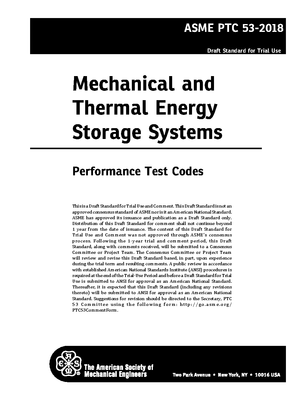 The object of this Code is to establish uniform test methods and procedures for conducting performance tests of mechanical or thermal energy storage systems (ESSs). An ESS is a system that consumes energy to increase the internal energy of the storage media and releases that stored energy to produce useful power or heat. The standard test procedures for ESSs established by this Code provide the highest level of accuracy consistent with current engineering practice.