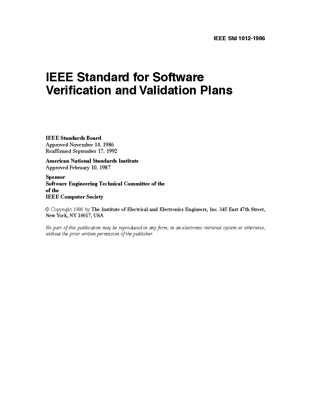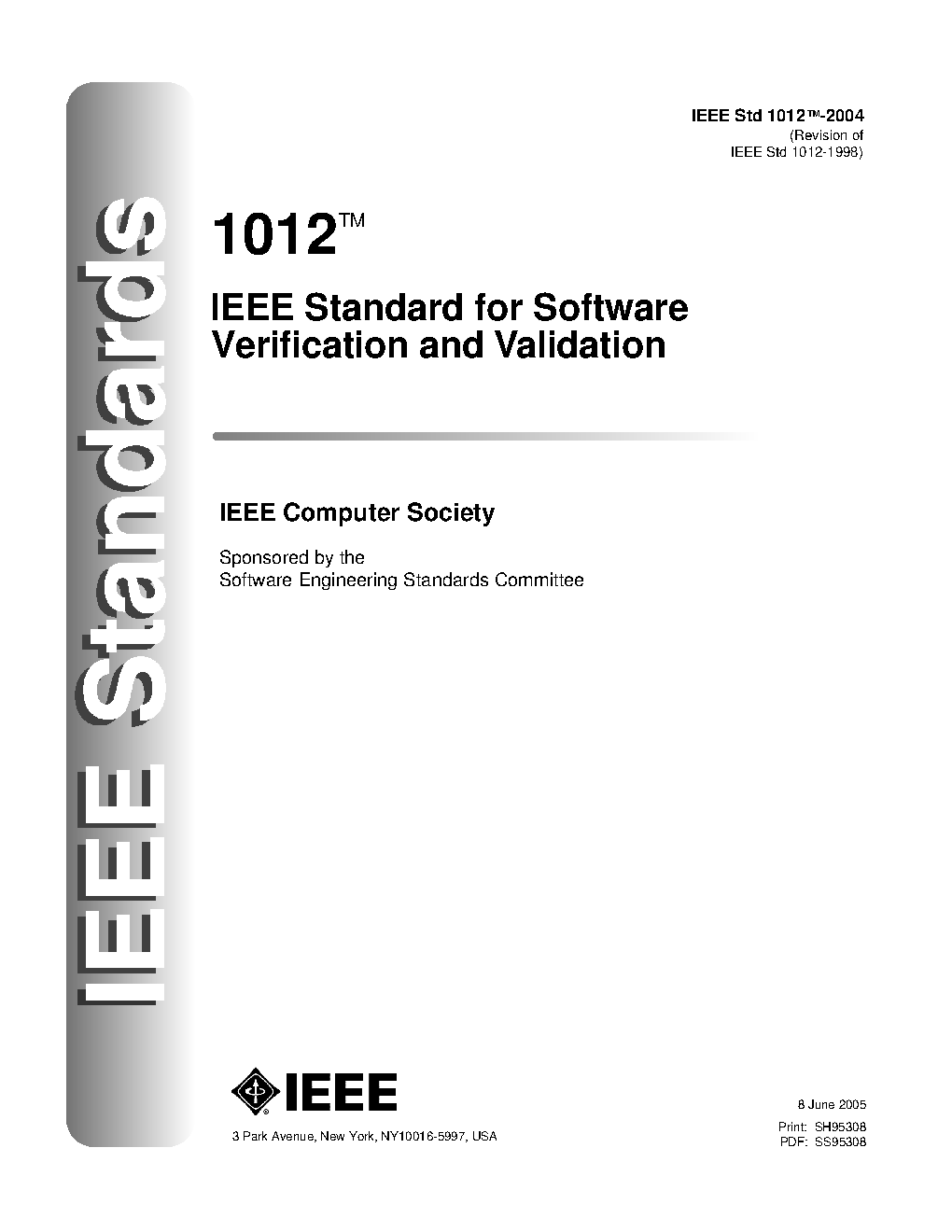 Software verification and validation (V&V) processes determine whether the development products of a given activity conform to the requirements of that activity and whether the software satisfies its intended use and user needs. Software V&V life cycle process requirements are specified for different software integrity levels. The scope of V&V processes encompasses software-based systems, computer software, hardware, and interfaces. This standard applies to software being developed, maintained, or reused [legacy, commercial off-the-shelf(COTS), non-developmental items]. The term software also includes firmware, microcode,and documentation. Software V&V processes include analysis, evaluation, review, inspection,assessment, and testing of software products.