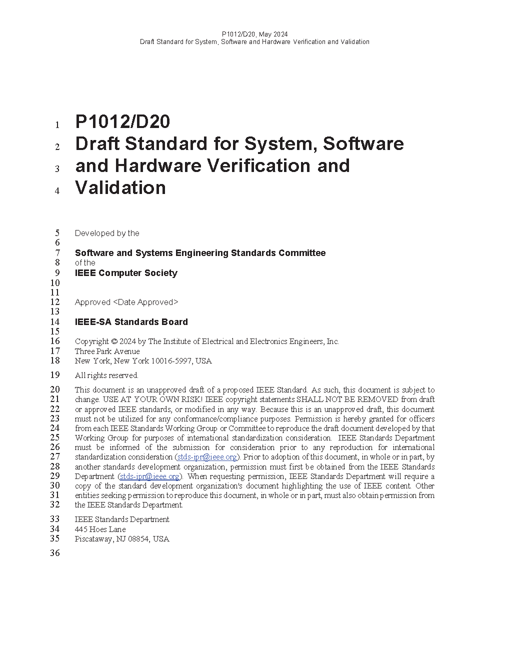 The scope of the proposed project does not change from the original scope of the standard. Software V&V is an technical discipline of the systems engineering process. IEEE Std 1012-1986 was a product standard defining the contents of the Software V&V Plan. IEEE Std 1012-1998 was a process standard defining the verification and validation processes in terms of specific activities and tasks. This proposed project will retain the standard as a process standard and will revise and update the definition of the activities and tasks to be consistent with industry usage. The updates are contained to selected sections and the project is scheduled to complete its work in a year with balloting in early 2004.