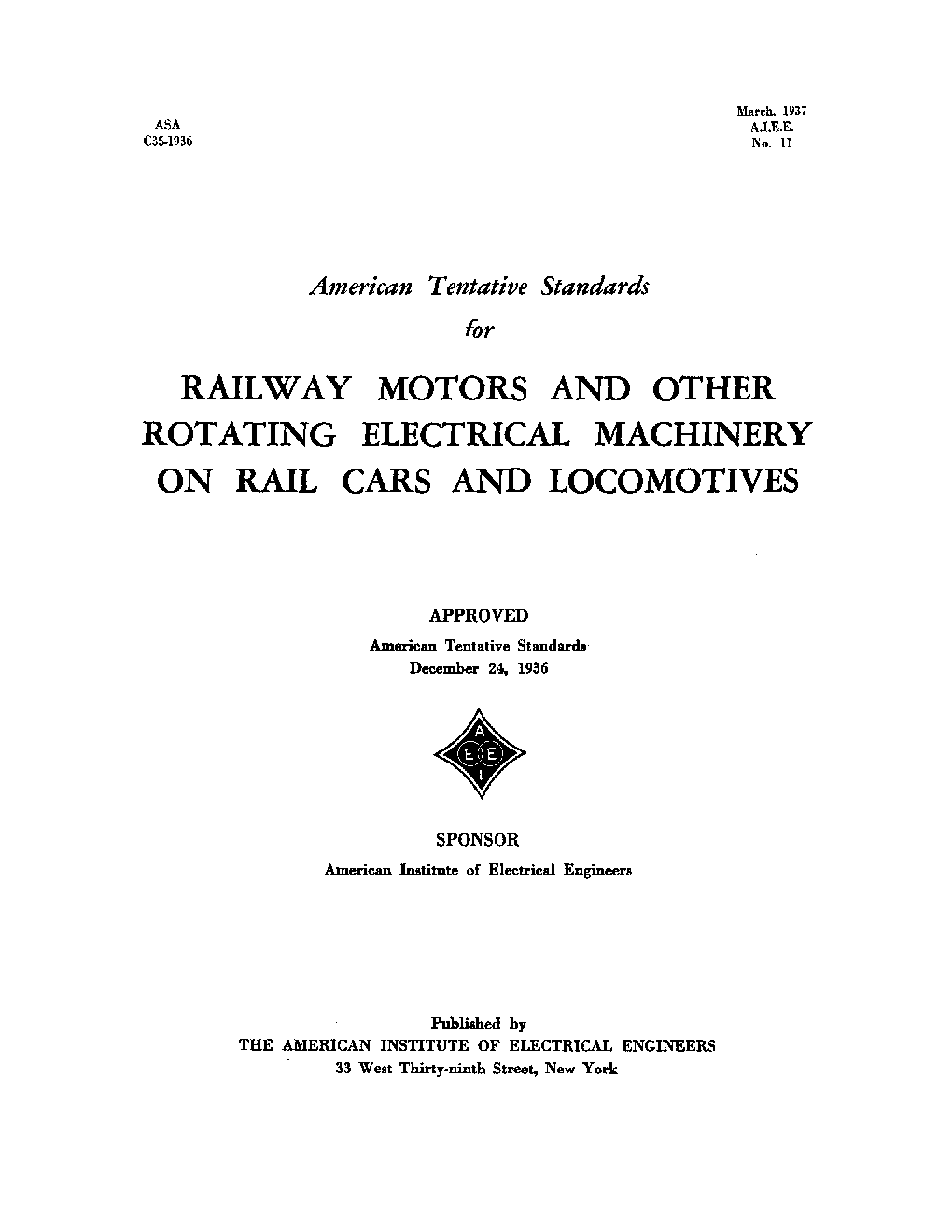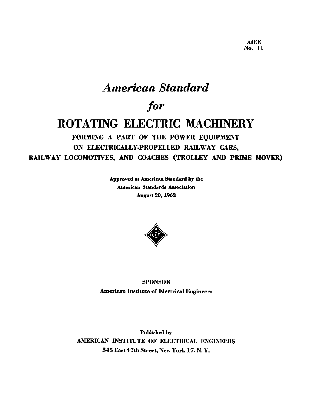 This standard applies to rotating electric machinery which forms part of the propulsion and major auxiliary equipment on internally and externally powered electrically propelled rail and road vehicles and similar large transport and haulage vehicles and their trailers where speciÞed in the contract. Major auxiliary equipment includes equipment such as blower and compressor motors, motor-generator and motoralternator sets, auxiliary generators, and exciters, usually larger than 3 kilowatts.