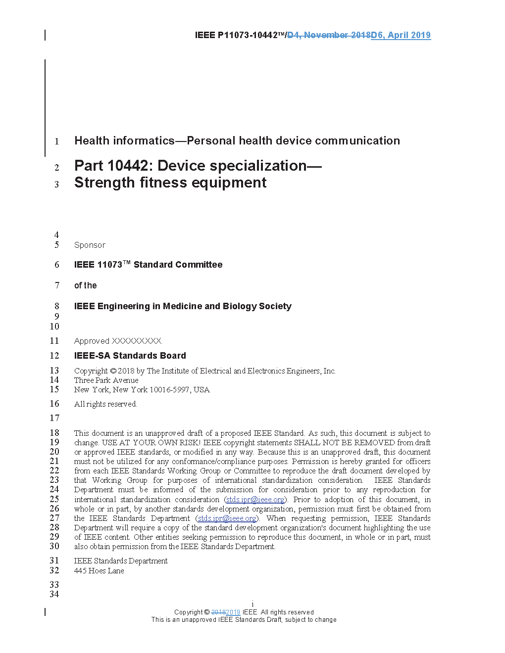 Within the context of the ISO/IEEE 11073 family of standards for device communication, this standard establishes a normative definition of the communication between personal strength fitness devices and managers (e.g., cell phones, personal computers [PCs], personal health appliances, and set top boxes) in a manner that enables plug-and-play interoperability. It leverages appropriate portions of existing standards, including ISO/IEEE 11073 terminology and information models. It specifies the use of specific term codes, formats, and behaviors in telehealth environments restricting optionality in base frameworks in favor of interoperability. This standard defines a common core of communication functionality for personal telehealth strength fitness devices. In this context, strength fitness devices are being used broadly to cover strength fitness devices that measure musculo-skeletal strength-conditioning activities.