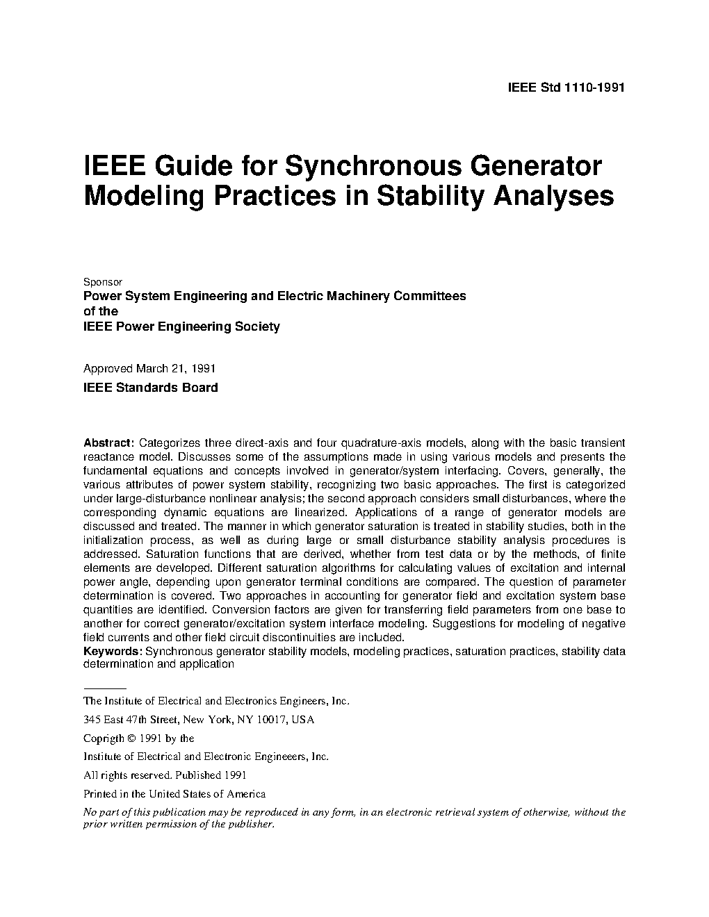 This guide contains instructions for modeling synchronous machines in direct- and quadrature-axis equivalent circuits, along with the basic transient and subtransient reactance/time-constants model in view of stability studies. It discusses assumptions made in using various models and presents the fundamental equations and concepts involved in generator/system interfacing. The manner in which generator saturation is treated in network studies, both in the initialization process as well as during large or small disturbance stability analysis procedures is addressed. Approaches for improving the accuracy of field and excitation system quantities are identified and conversion factors are given for transferring field parameters from one base to another for correct generator/excitation system interface modeling. Parameter determination and translation from equivalent-circuits to operational impedances or vice-versa is covered. Data analysis methods for obtaining these parameters using measurements from field tests or finite-element computations are explained and illustrated with a wide range of generator and test data. However, this guide refers to applicable standards (such as IEEE Std 115) or contract specification for scheduling such tests. Also, this guide does not attempt to recommend specific procedures for machine representation in non-standard or atypical cases such as generator tripping and overspeed operation or models for harmonics or unbalanced operation.