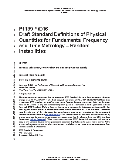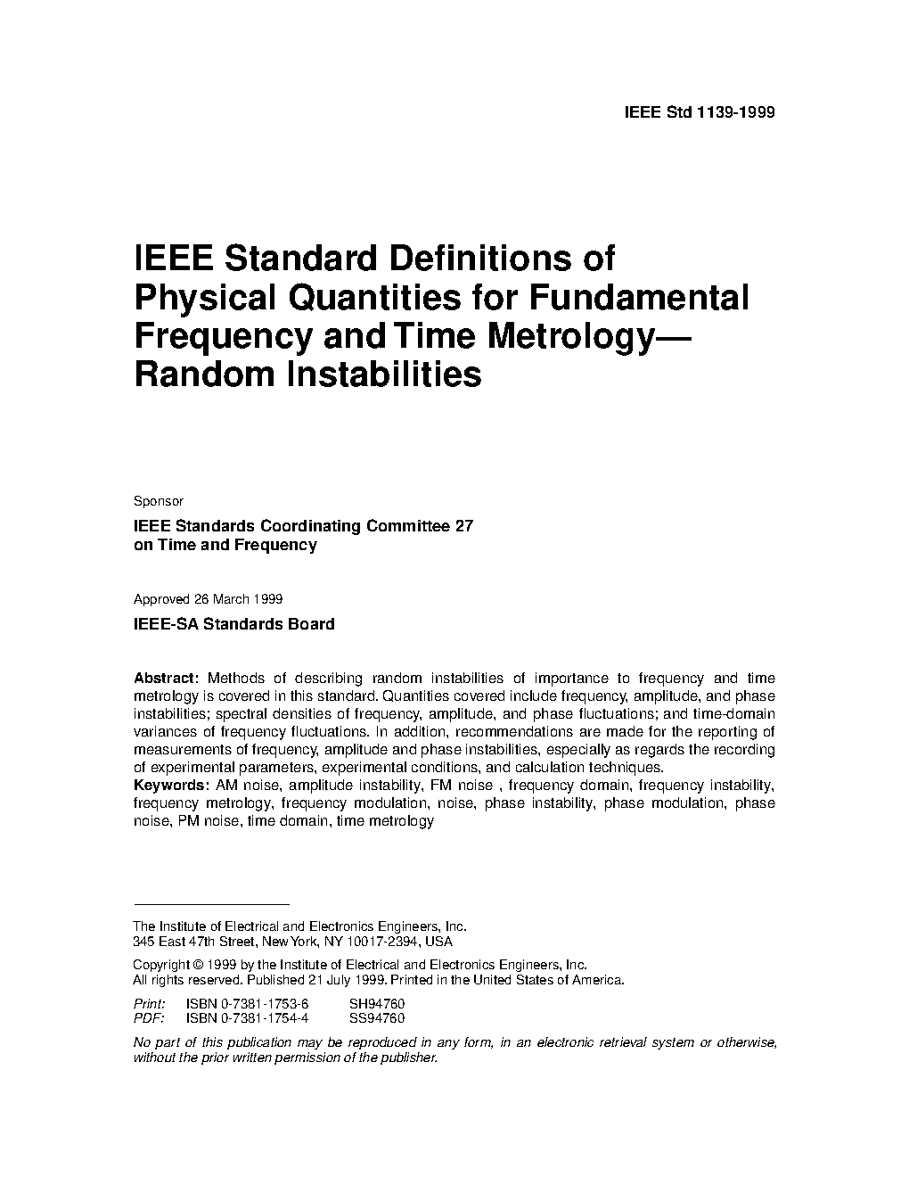 Methods of describing random instabilities of importance to frequency and time metrology is covered in this standard. Quantities covered include frequency, amplitude, and phase instabilities; spectral densities of frequency, amplitude, and phase fluctuations; and time-domain variances of frequency fluctuations. In addition, recommendations are made for the reporting of measurements of frequency, amplitude and phase instabilities, especially as regards the recording of experimental parameters, experimental conditions, and calculation techniques.