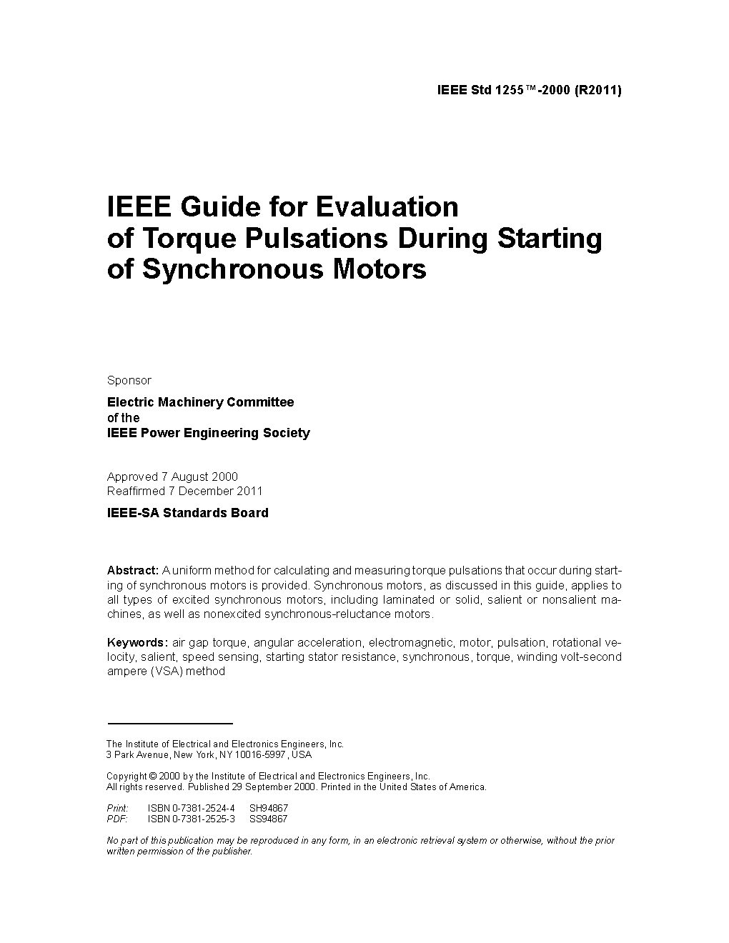 To assist in providing a uniform method for calculating and measuuring torque pulsations which occur during starting of synchronous motors. Synchronous motors as discussed in this guide specifically refer to salient-pole type motors with wound main field circuits with either a continuous or interrupted amortisseur cage/ In modern installations, direct current is applied to the main field by means of slip rings from a static exciter or by a rotating brushless excitation system to establish synchronous operation.