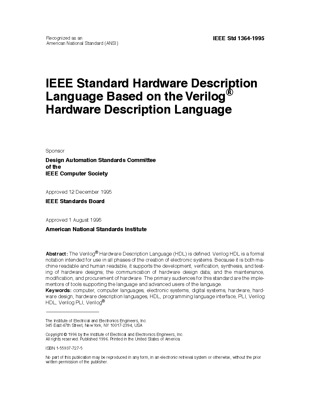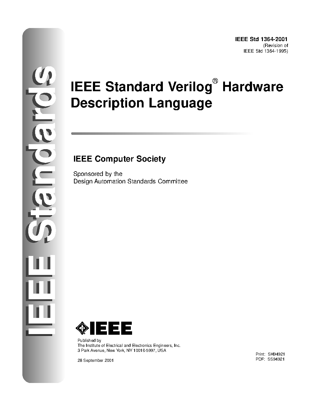Supersedes 1364-1995. The Verilog(R) Hardware Description Language (HDL) is defined in this standard. Verilog HDL is a formal notation intended for use in all phases of the creation of electronic systems. Because it is both machine readable and human readable,it supports the development,verification, synthesis,and testing of hardware designs; the communication of hardware design data; and the maintenance,modification,and procurement of hardware. The primary audiences for this standard are the implementors of tools supporting the language and advanced users of the language.