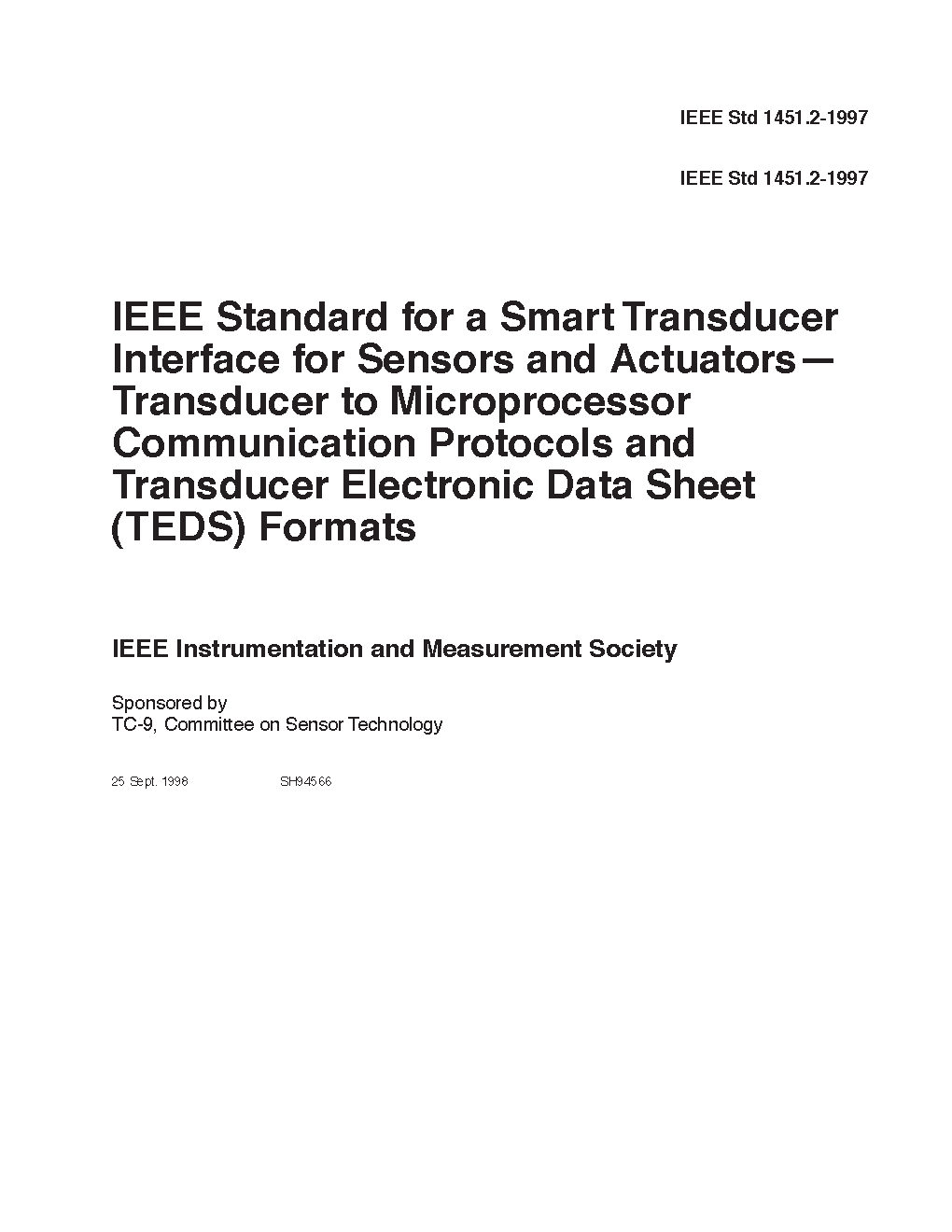 A digital interface for connecting transducers to microprocessors is defined. A TEDS and its data formats are described. An electrical interface, read and write logic functions to access the TEDS and a wide variety of transducers are defined. This standard does not specify signal conditioning, signal conversion, or how the TEDS data is used in applications.