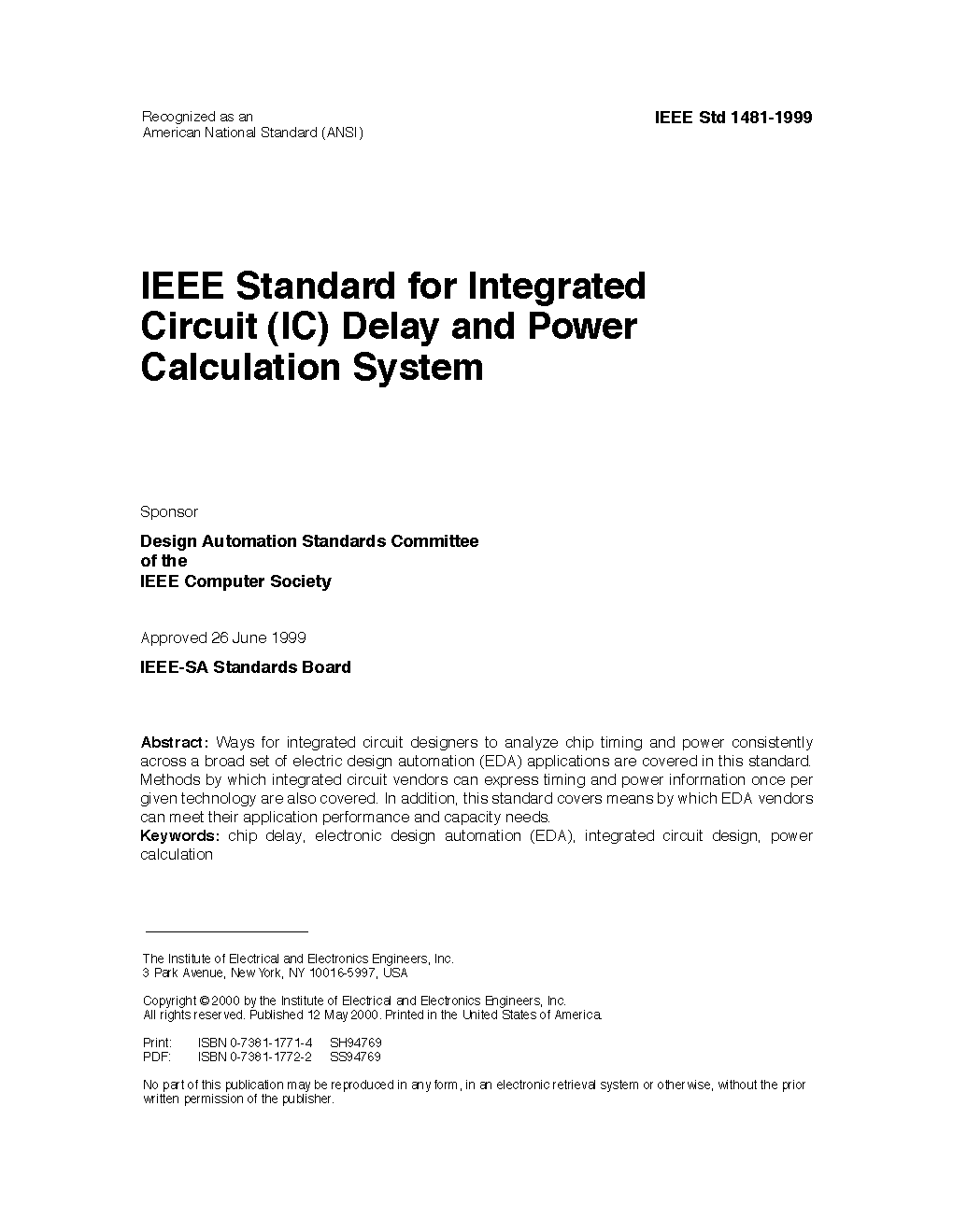 Ways for integrated circuit designers to analyze chip timing and power consistently across a broad set of electric design automation (EDA) applications are covered in this standard. Methods by which integrated circuit vendors can express timing and power information once per given technology are also covered. In addition, this standard covers means by which EDA vendors can meet their application performance and capacity needs.