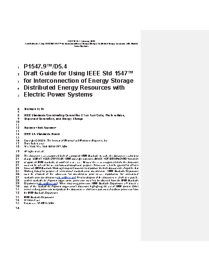 This guide provides information on, and examples of, how to apply IEEE Std 1547-2018 for the interconnection of energy storage distributed energy resources (ES DER). The guide’s scope includes ES DER that are interfaced to an electric power system (EPS) via a power electronic interface (commonly referred to as a converter, inverter, or bidirectional inverter), capable of bidirectional active and reactive power flow, and capable of exporting active power to the EPS. The document also provides guidance for non-exporting ES DER that could have power system impacts, e.g., modulating load proportionally to system frequency, such as some uninterruptible power supply (UPS) systems and electric vehicle (EV) chargers.