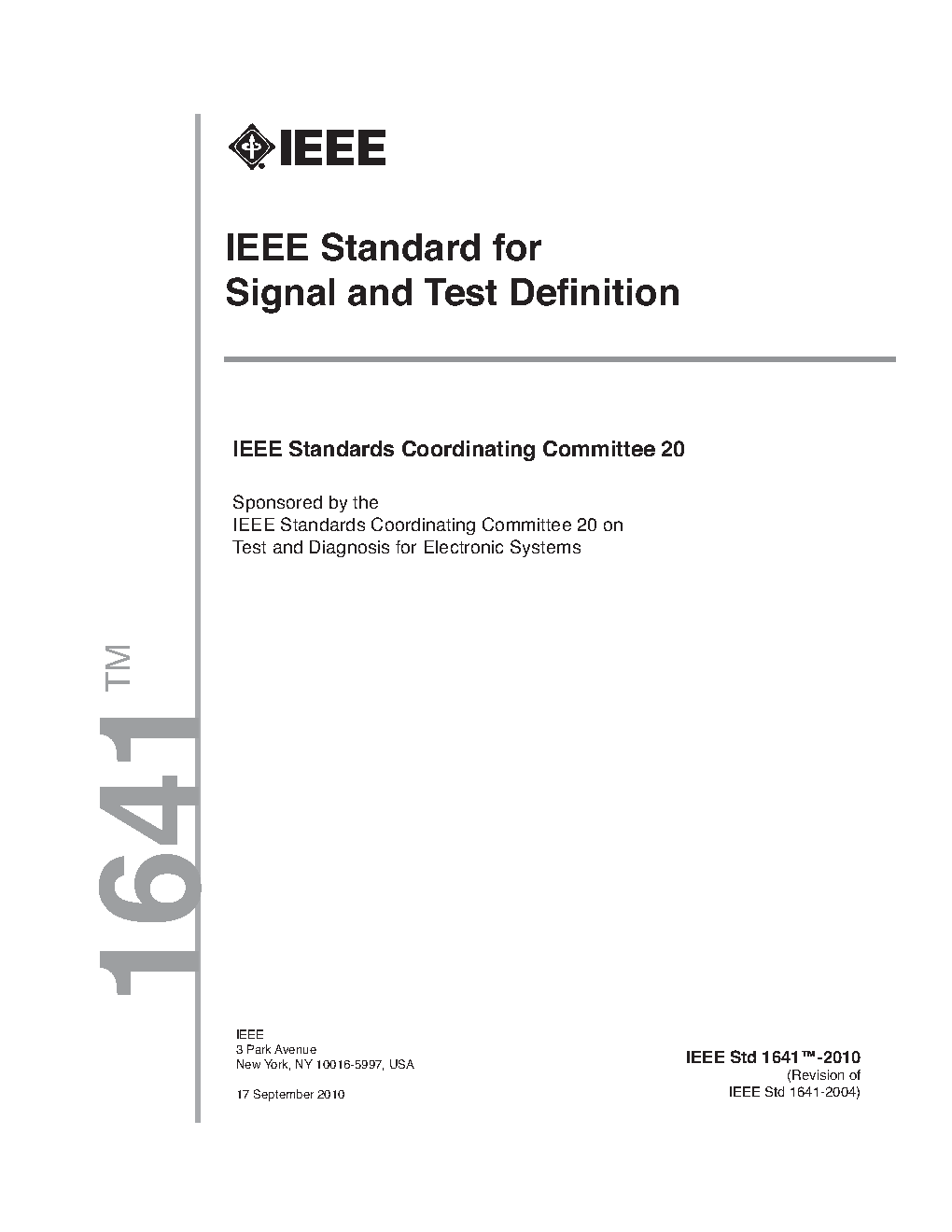 This standard provides the means to define and describe signals used in testing. It also provides a set of common basic signals, built upon formal mathematical specifications so that signals can be combined to form complex signals usable across all test platforms. This standard contains additional downloads at http://standards.ieee.org/downloads/1641/1641-2010