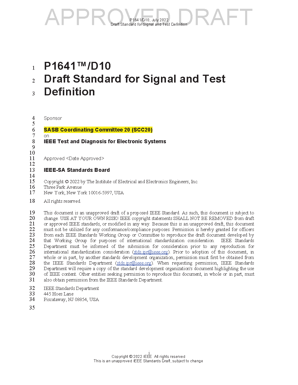 This standard provides the means to define and describe signals used in testing. It provides a set of common basic signal definitions, built upon formal mathematical specifications, so that signals can be combined to form complex signals usable across all test platforms. The standard provides support for structural textual languages and programming language interfaces for interoperability.