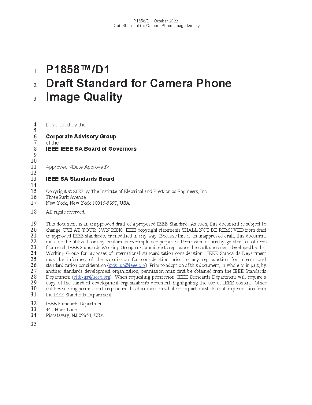 Camera-equipped mobile devices have become ubiquitous, displacing dedicated digital cameras as many users' primary tools for photography. However, consumers have little guidance about the quality of the images produced by particular device models. That lack of guidance is due in part to a lack of uniform image quality testing for the devices, and what testing is done seldom is accessible to the layperson. This standard attempts to establish a uniform means of evaluating the quality of cameras in mobile devices, allowing objective comparison between devices, models, and manufacturers, using a variety of metrics that are relevant to consumer photography.