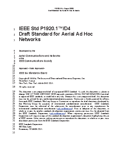 IEEE Std 1920.1 defines air-to-air communications for self-organized ad hoc aerial networks. It outlines the network service architecture, security framework, and data model. IEEE Std 1920.1 is agnostic to the type of network (Wireless or Cellular or other) and it is applicable to manned and unmanned, small and large, and civil and commercial aircraft systems. IEEE Std 1920.1 is the first in the series of IEEE P1920.X standards. It is anticipated that IEEE Std 1920.1 will be used as a foundation to define more specific standards in this series.