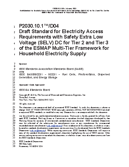 IEEE Approved Draft Standard for Electricity Access Requirements with Safety Extra Low Voltage (SELV) DC for Tier 2 and Tier 3 of the ESMAP Multi-tier Framework for Household Electricity Supply