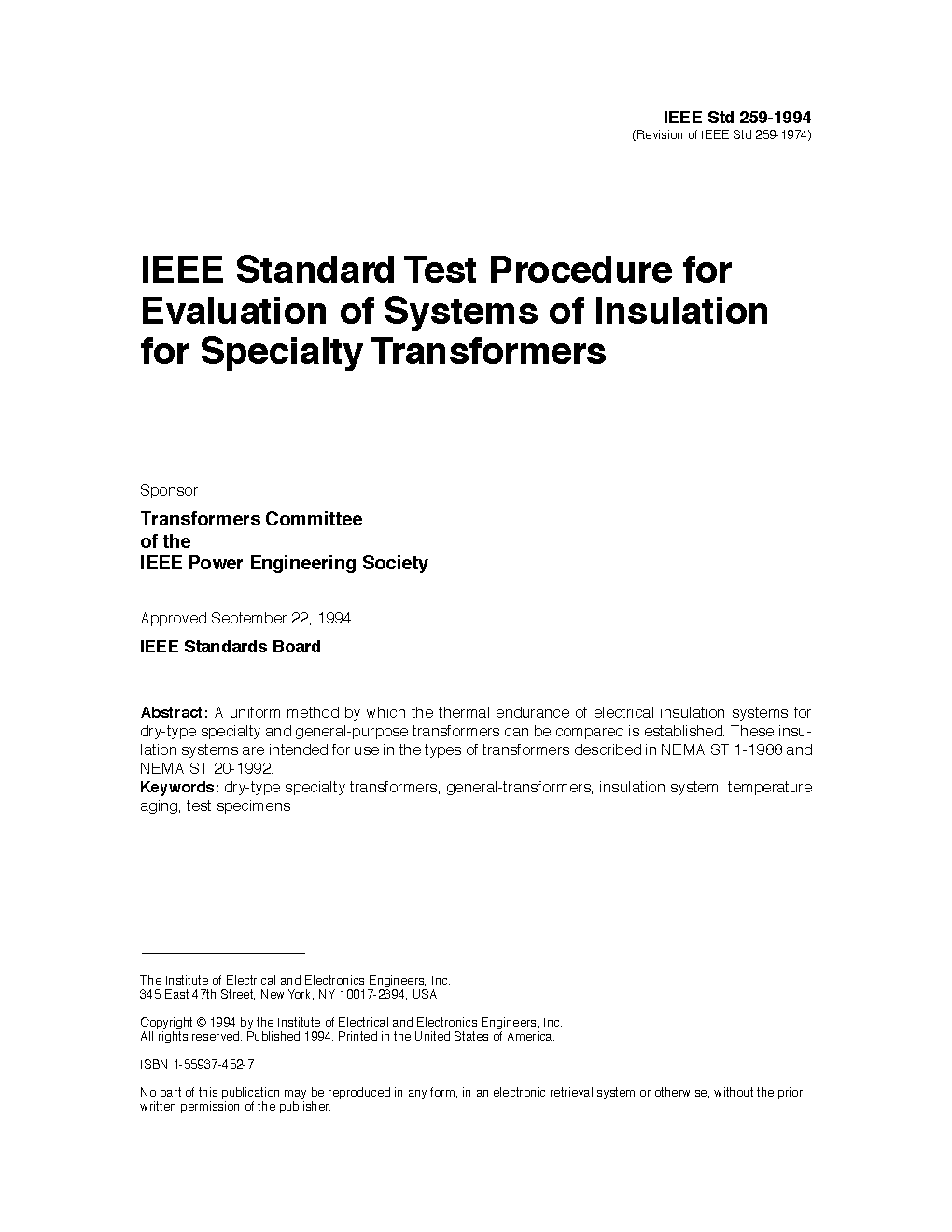 IEEE Standard Test Procedure for Evaluation of Systems of Insulation for Specialty Transformers