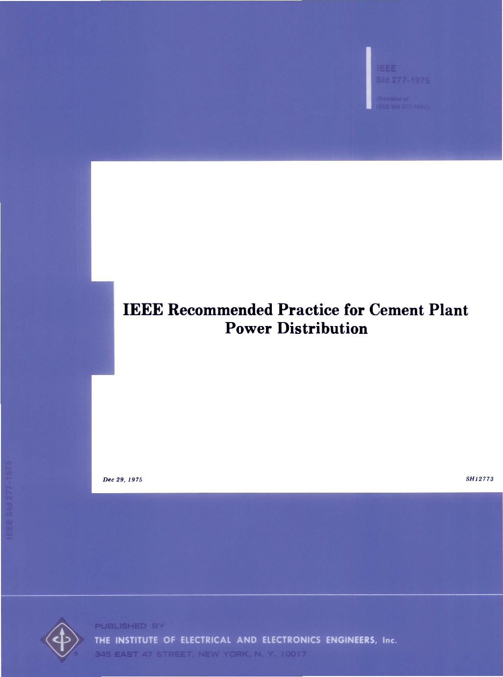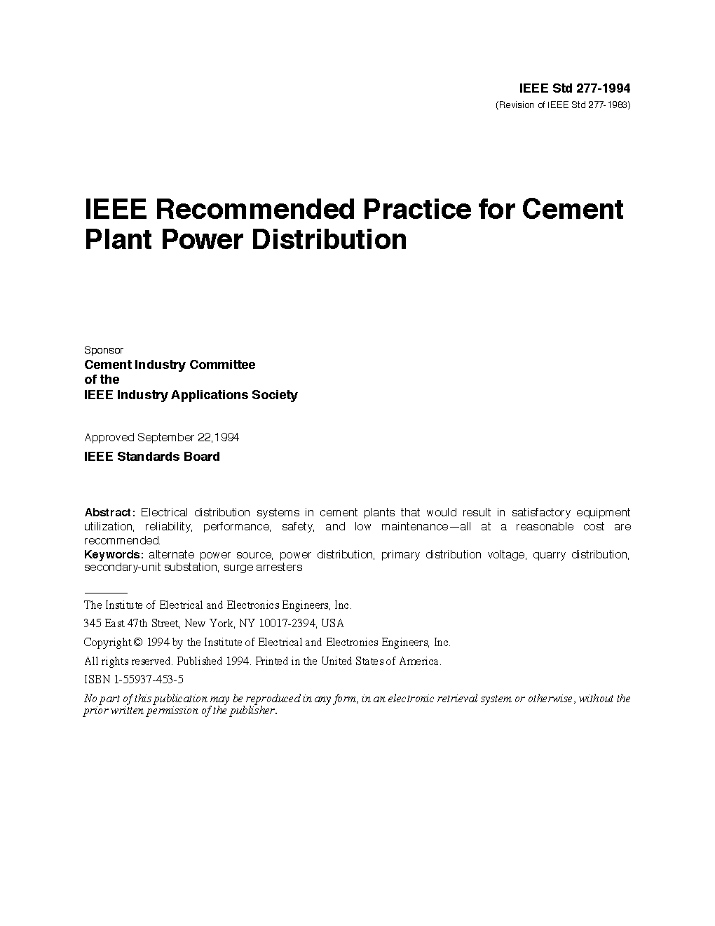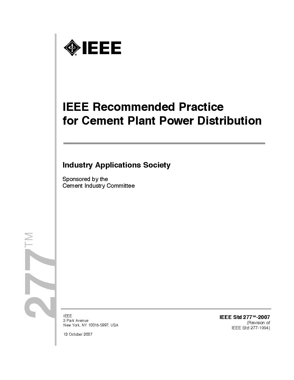 This document has been developed as a recommended practice for electrical distribution systems in cement plants with the objective of satisfactory equipment utilization, reliability, performance, safety, and low maintenance—all at a reasonable cost. Revision of IEEE Std 277-1994