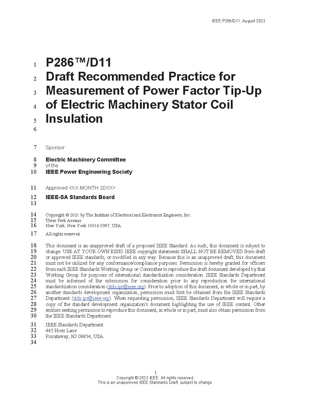 The purpose of this recommended practice is to describe the power-factor tip-up of coil insulation and to establish preferred procedures for its measurement. This recommended practice applies to stator coils of rotating machinery operating at 6600 V or higher. the coil Insulation under consideration is principally the major ground-wall insulation which is external to the conductor structure. Only that part of the strand and turn insulation which dielectrically in series with the ground-wall insulation enters into the measurements.