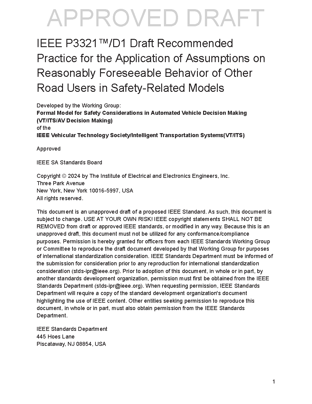 IEEE Draft Recommended Practice for the Application of Assumptions on Reasonably Foreseeable Behavior of Other Road Users in Safety Related Models