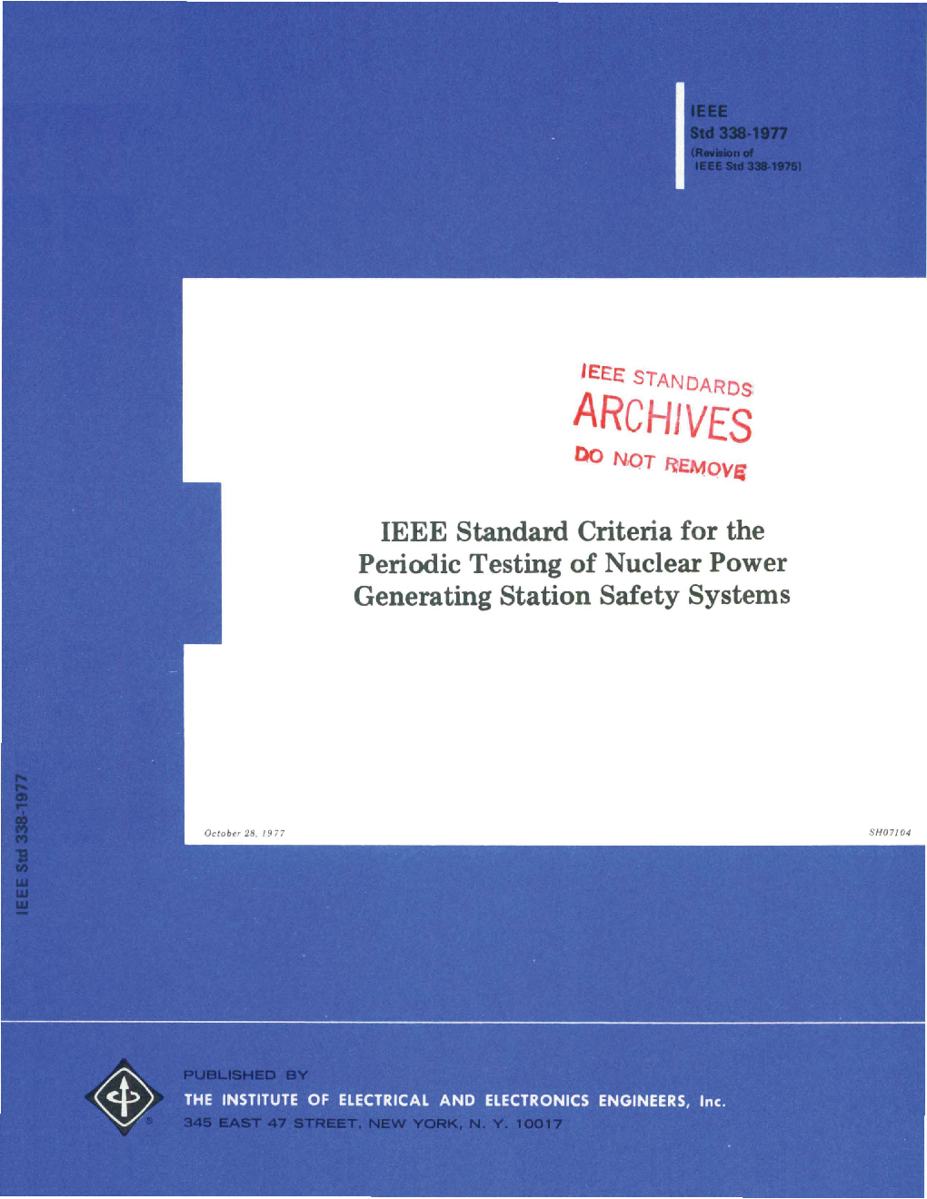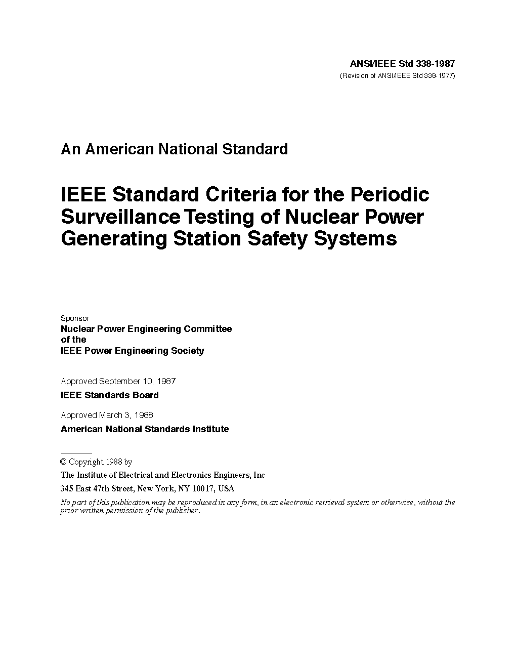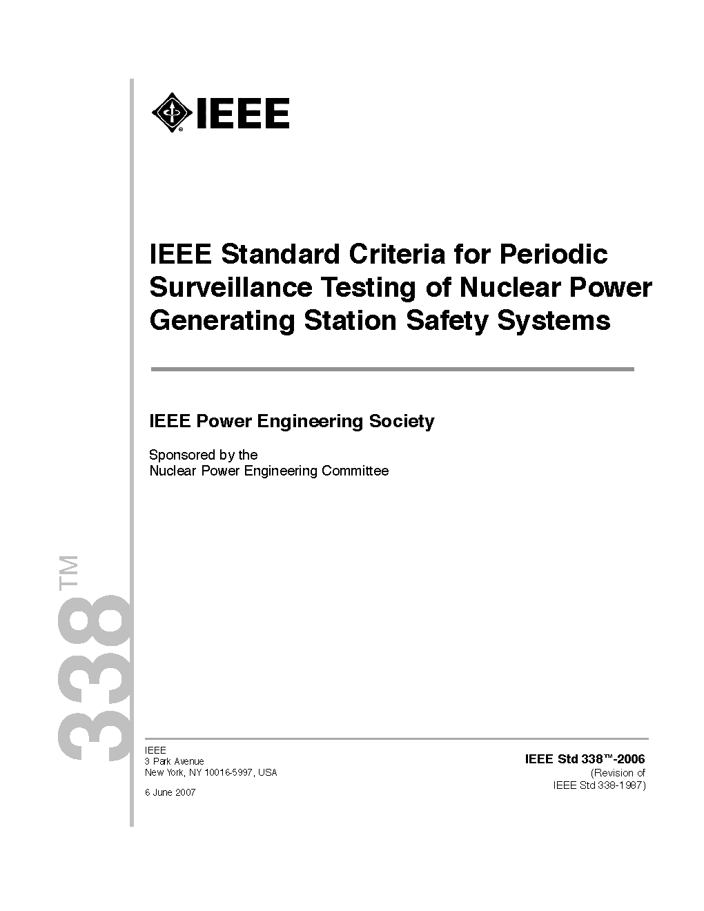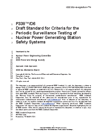 IEEE Standard for Criteria for the Periodic Surveillance Testing of Nuclear Power Generating Station Safety Systems safety function. Post-maintenance and post-modification testing are not covered by this document. This standard amplifies the periodic surveillance testing requirements of other IEEE nuclear standards.