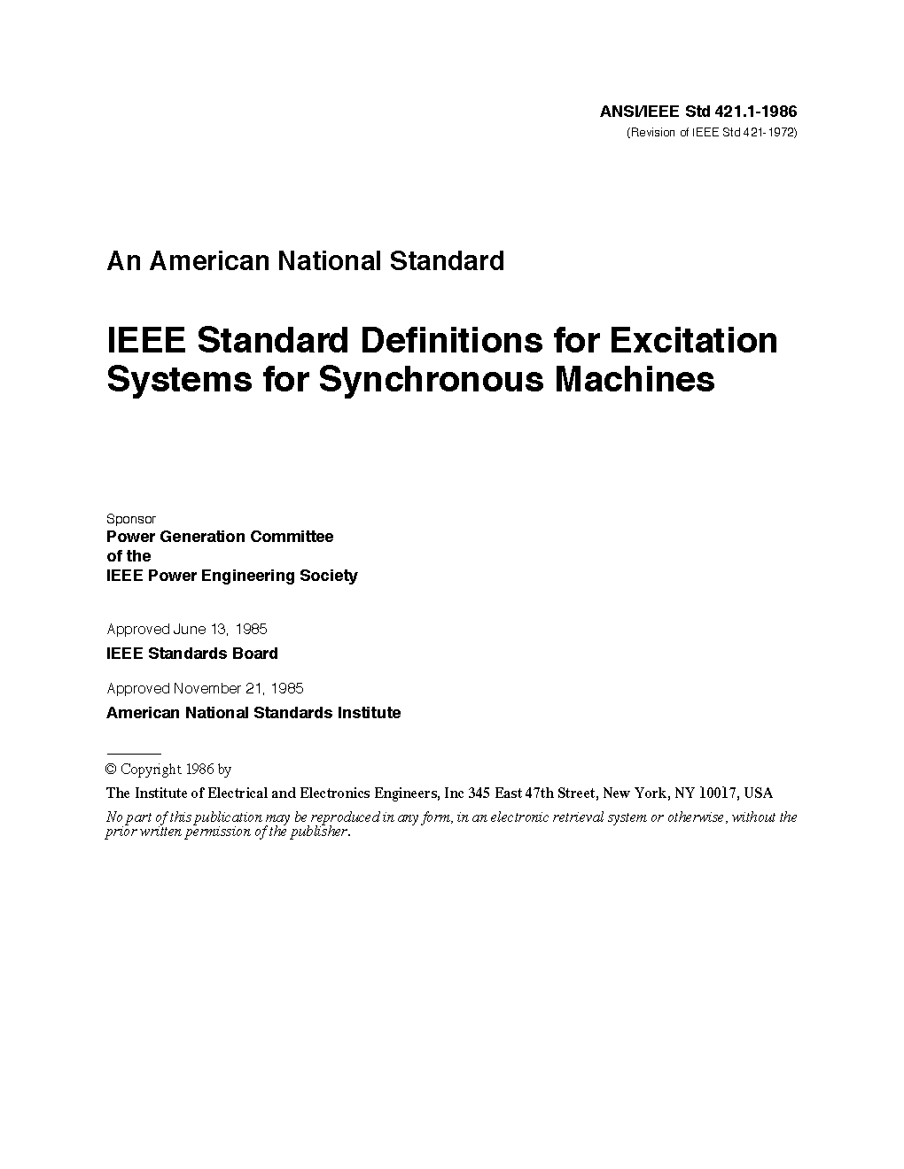 IEEE Standard Definitions for Excitation Systems for Synchronous Machines