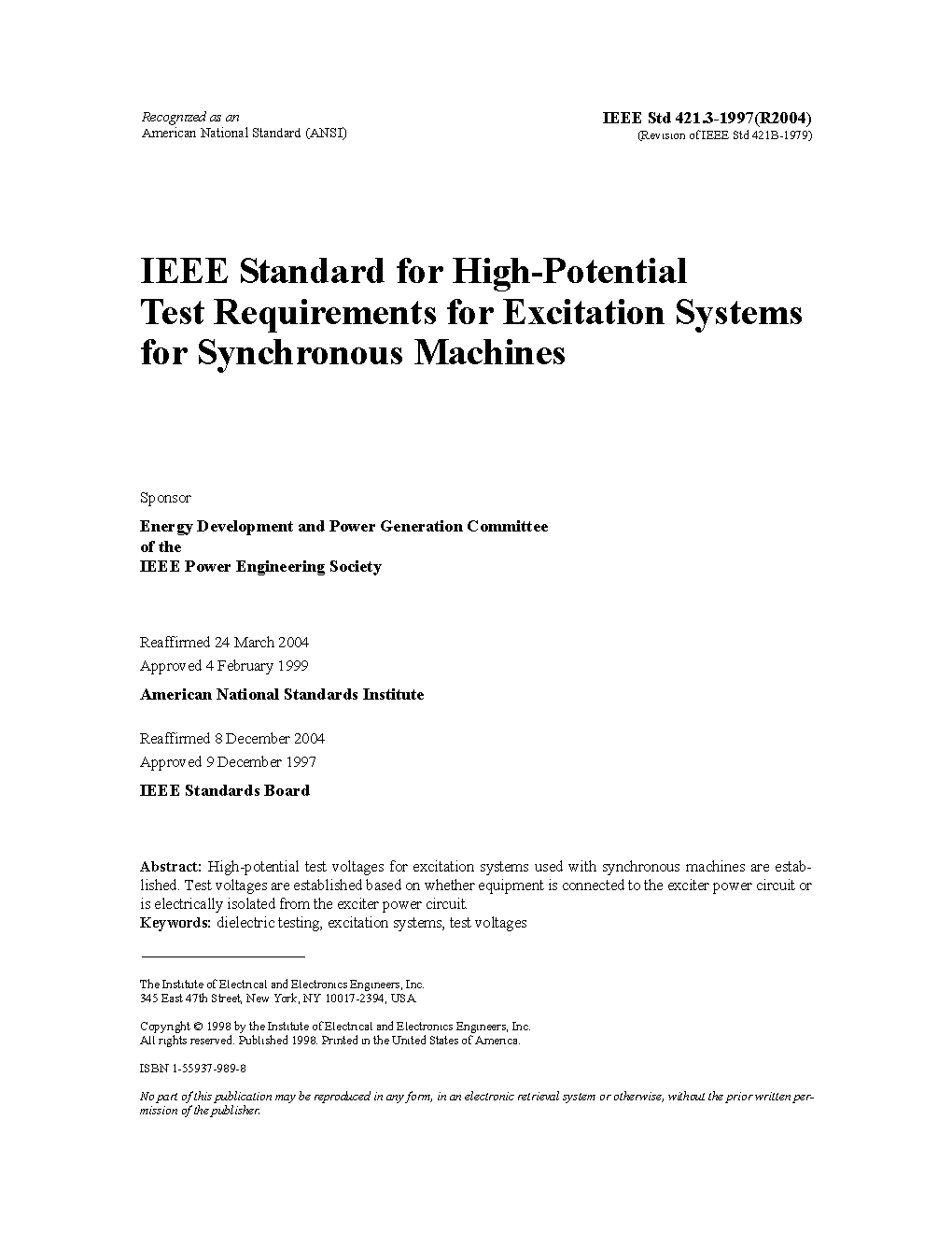 IEEE Standard for High-Potential Test Requirements for Excitation Systems for Synchronous Machines