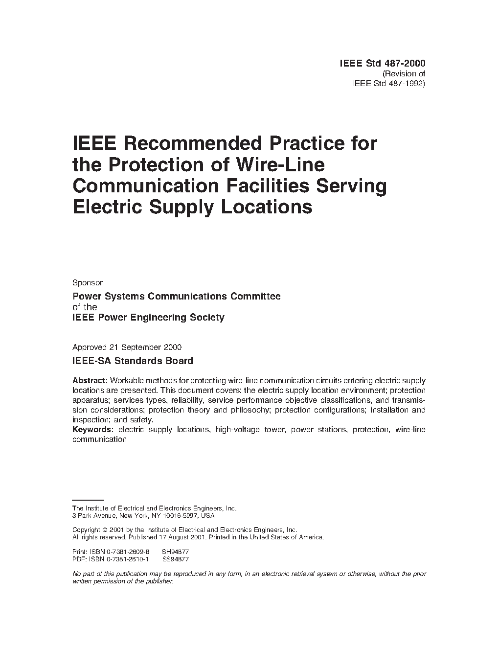 Workable methods for protecting wire-line communication circuits entering electric supply locations are presented. This document covers: the electric supply location environment; protection apparatus; services types, reliability, service performance objective classifications, and transmis-sion considerations; protection theory and philosophy; protection configurations; installation and inspection; and safety. Remarks: Revised by IEEE Std 287-2007
