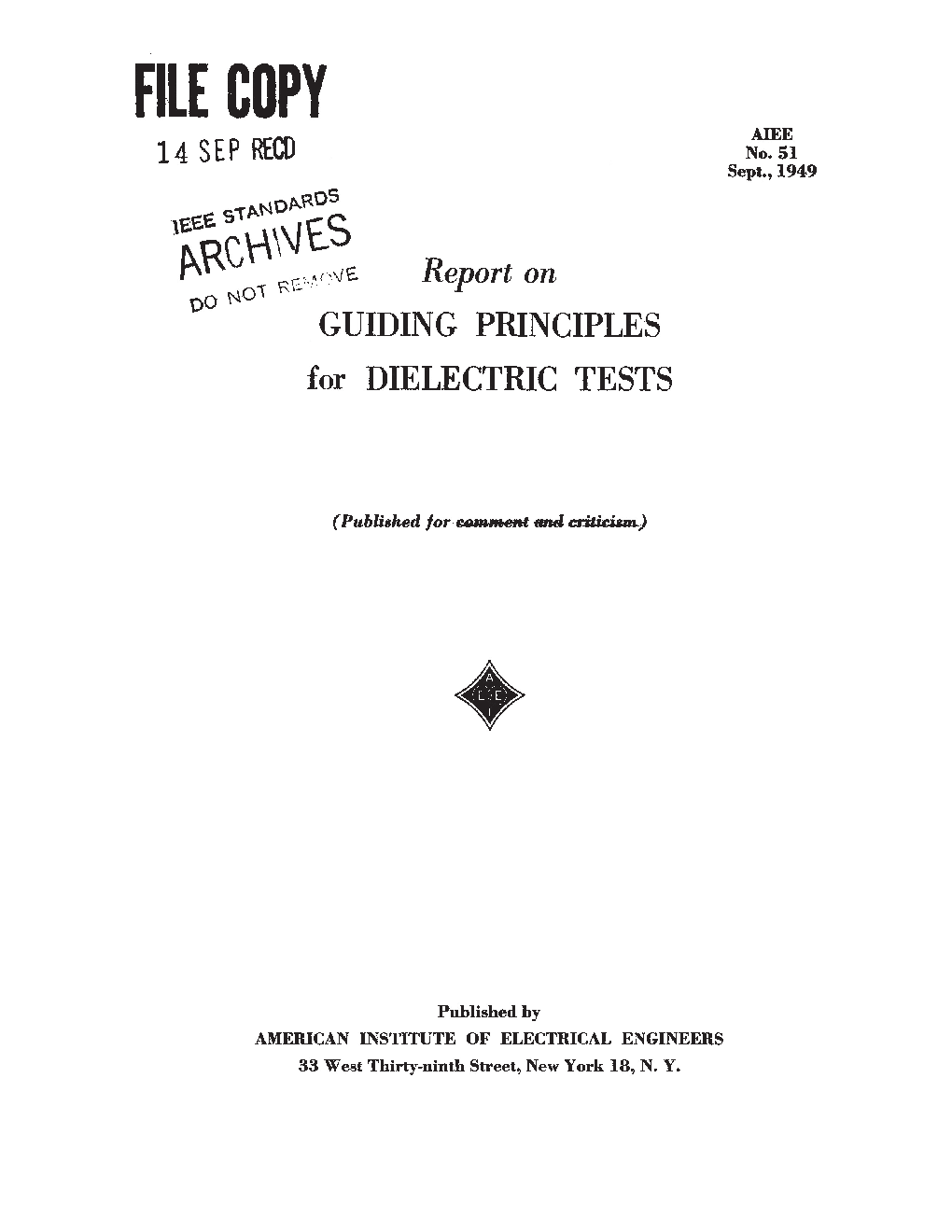 (3) to propose guiding principles for the selection of dielectric test values (4) to investigate other types of testing to determine their latent usefulness and the desirability of standardization.