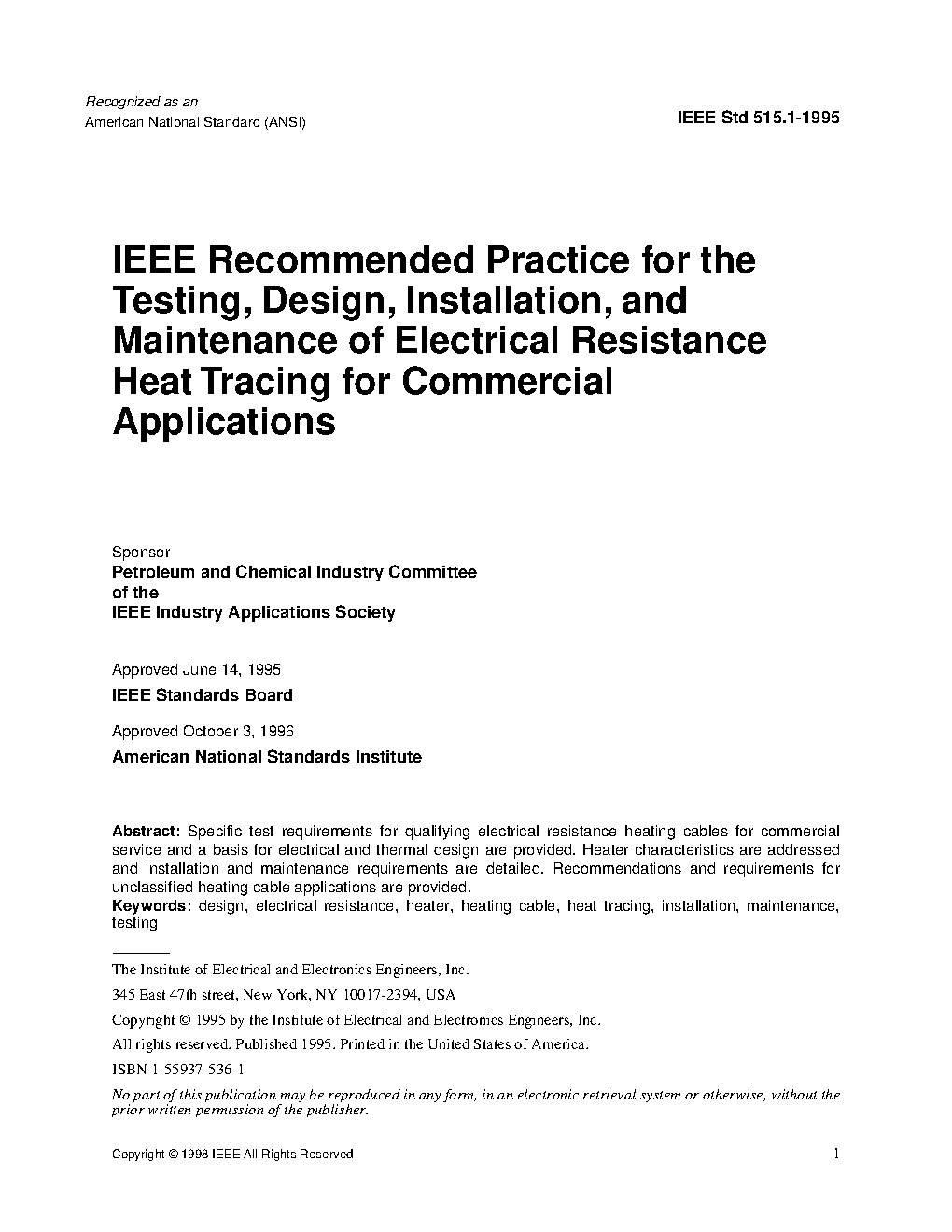 This recommended practice provides detailed recommendations for the testing, design, installation, and maintenance of electrical resistance heat tracing in commercial applications. Commercial applications include installations inside and outside of commercial business buildings, such as office buildings, hospitals, and airports. Typical applications include freeze water pipes; temperature maintenance of hot water piping and other lines and tubing; protection of sprinkler systems; roof, gutter, and pavement deicing; and other applications as shown in table . The recommendation also include test criteria to determine the suitability of heating cables and fittings that are utilized for these applications. Commercial applications involving hazardous (classified) locations should meet the requirements in IEEE Std 515-1989 in addition to the requirements in this document.