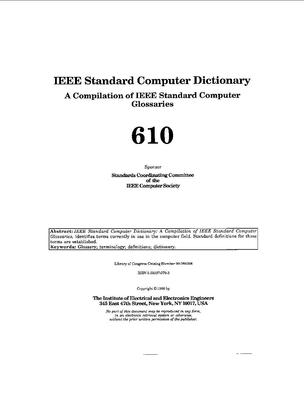 This dictionary is a compilation of IEEE standard glossaries covering the fields of mathematics of computing, computer applications, modeling and simulation, image processing and pattern recognition, data management, and software engineering. Every effort has been made to include all terms within the designated subject areas. Terms were excluded if they were considered to be parochial to one group or organization; company-proprietary or trademarked; multiword terms whose meaning could be inferred from the definitions of the component words; or terms whose meaning in the computer field could be directly inferred from their standard English meaning.