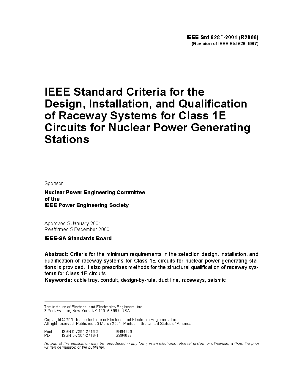Criteria for the minimum requirements in the selection design, installation, and qualifica-tion of raceway systems for Class 1E circuits for nuclear power generating stations is provided. Italso prescribes methods for the structural qualification of raceway systems for Class 1E circuits.