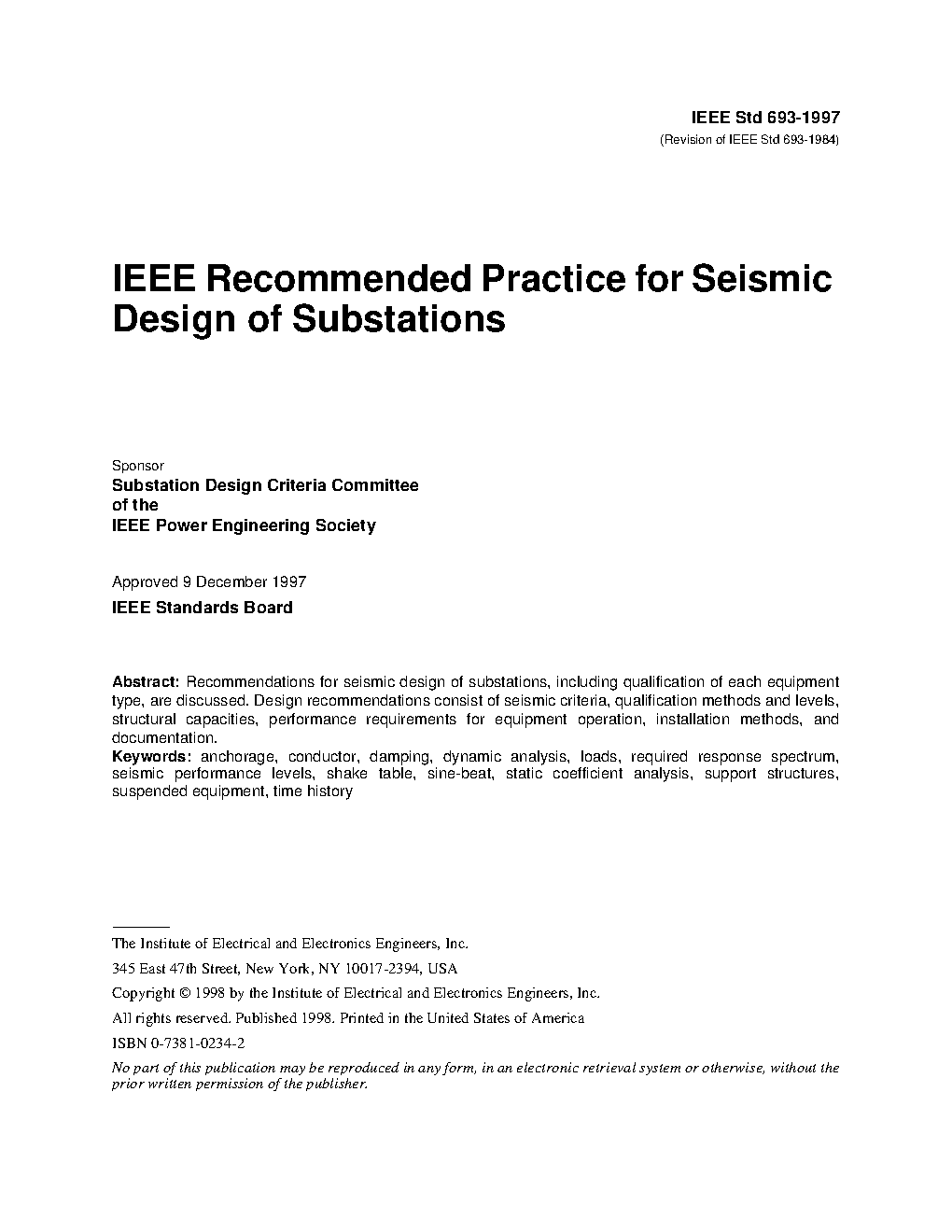Superseded by IEEE Std 693-2005 Recommendations for seismic design of substations, including qualification of each equipmenttype, are discussed. Design recommendations consist of seismic criteria, qualification methods and levels,structural capacities, performance requirements for equipment operation, installation methods, anddocumentation.