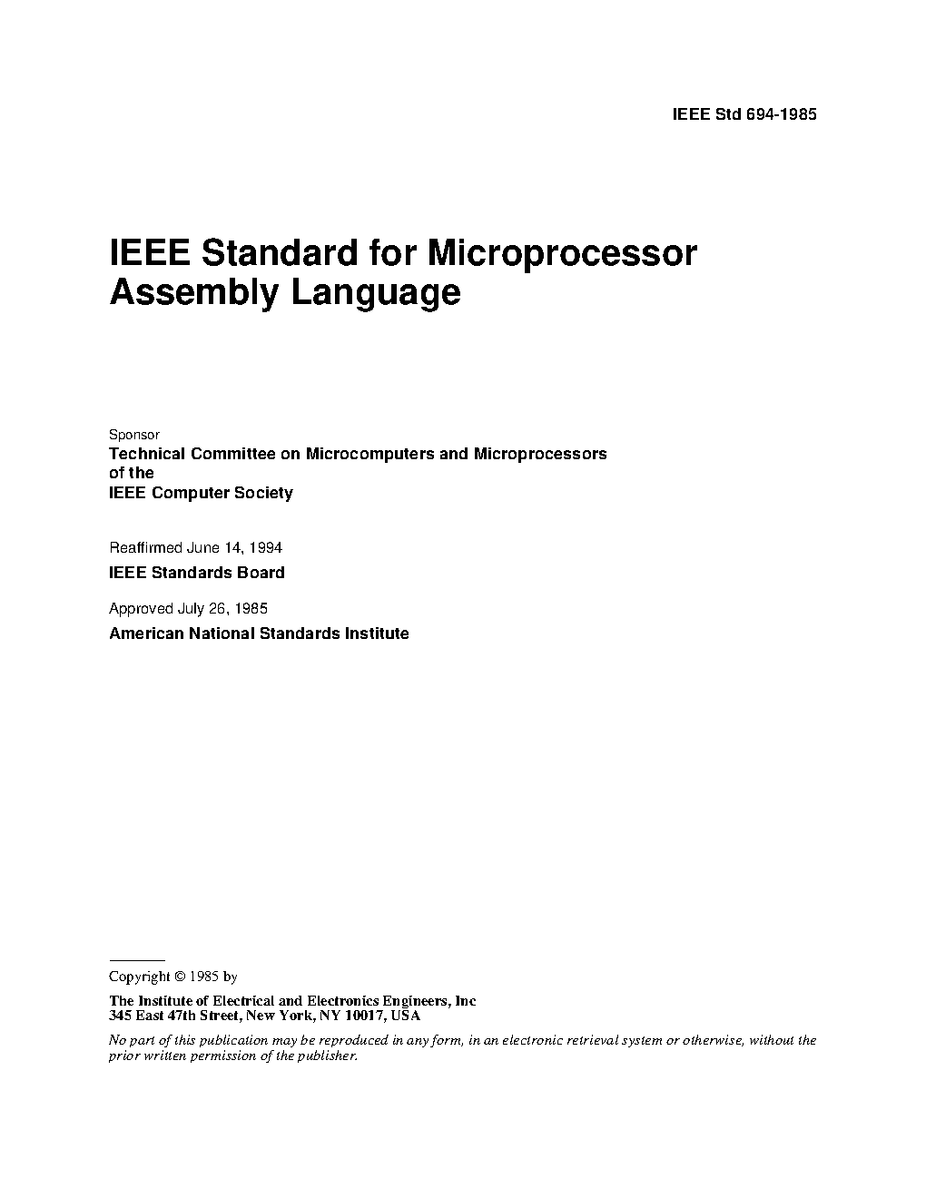 The purpose of this standard is to establish uniform requirements for instruction naming, instruction mnemonics, and assembly language syntax. It is intended to be used as a basis for microprocessor assembler specification. This standard sets forth the functional definitions and corresponding mnemonics for microprocessor instructions. The specific set of instructions differs for each type of processor. Likewise, the number of condition codes and their setting and resetting is processor-dependent, and is not prescribed by this standard. Each user of a particular microprocessor should be thoroughly conversant with its operation and should make no a priori assumptions with regard to the detailed behavior of its instructions.
