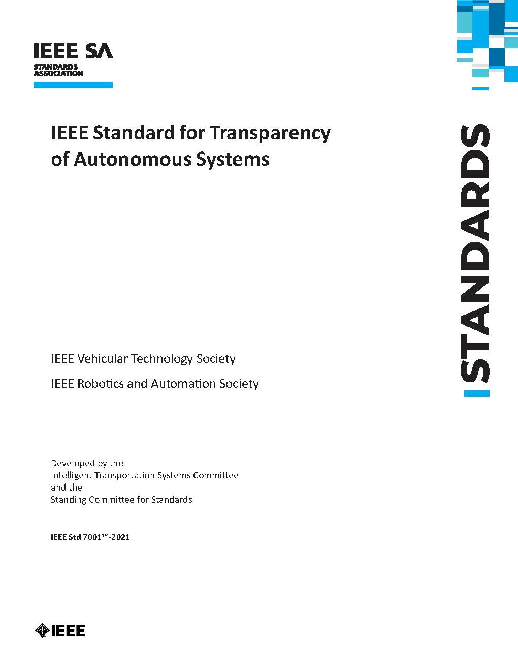 Measurable, testable levels of transparency, so that autonomous systems can be objectively assessed, and levels of compliance determined, are described in this standard. (The PDF of this standard is available in the IEEE GET program at https://ieeexplore.ieee.org/browse/standards/get-program/page/series?id=93)