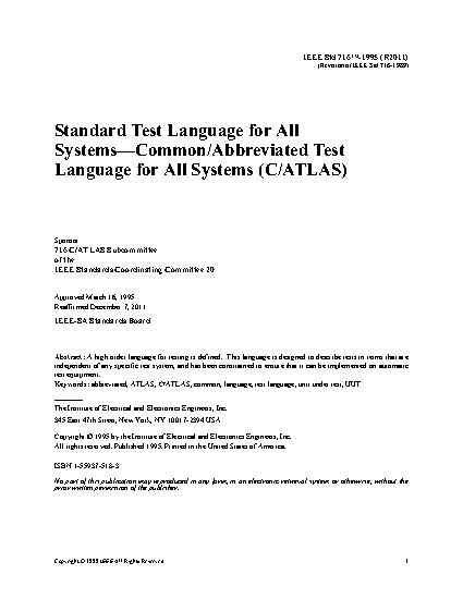 Superseded by 716-1995. Common ATLAS (C/ATLAS), a high-order language for testing is defined. C/ATLAS is designed to describe tests in terms that are independent of any specific test system. It has been constrained to ensure that it can be implemented on automatic test equipment.